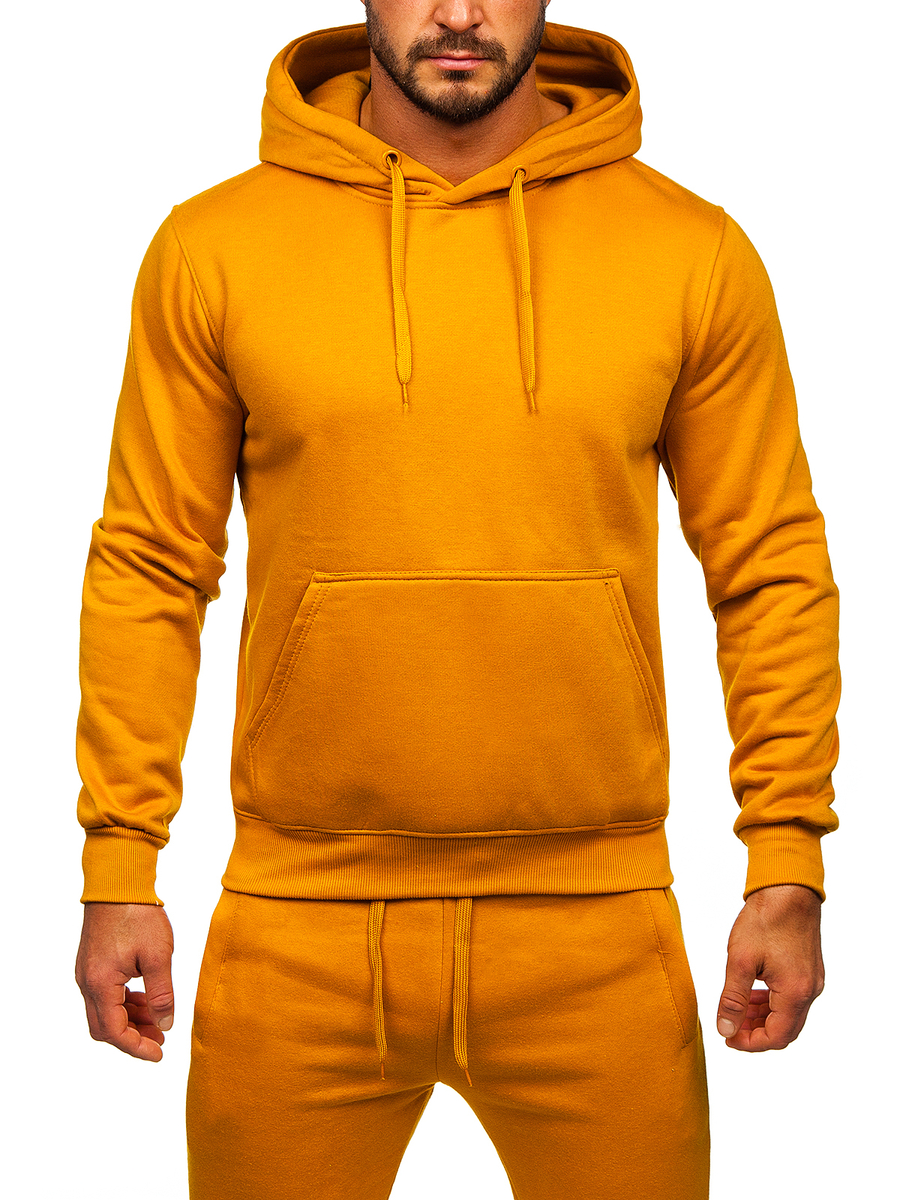 Fantastic camel sport men's tracksuit D003 from the Bolf collection. The set includes a short hoodie and sweatpants. The pants are adjustable at the waist with a strong welt and drawstring, and two pockets on the sides. A simple, fitted cut gives them a sporty look. It was made of a soft and pleasant in touch fabric. A tracksuit set can be a universal base for building everyday or sports stylizations. Both the sweatshirt and pants can be combined with other items of clothing, thus obtaining many possibilities for creating everyday stylizations. The set will perfectly match a T-shirt, a lightweight jacket or a sport jacket. Sweatsuits are recommended to be worn at home, on a walk, while shopping, or during sports in the gym or outdoors.