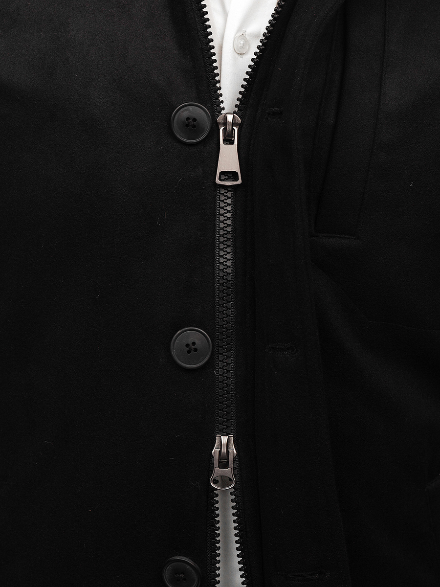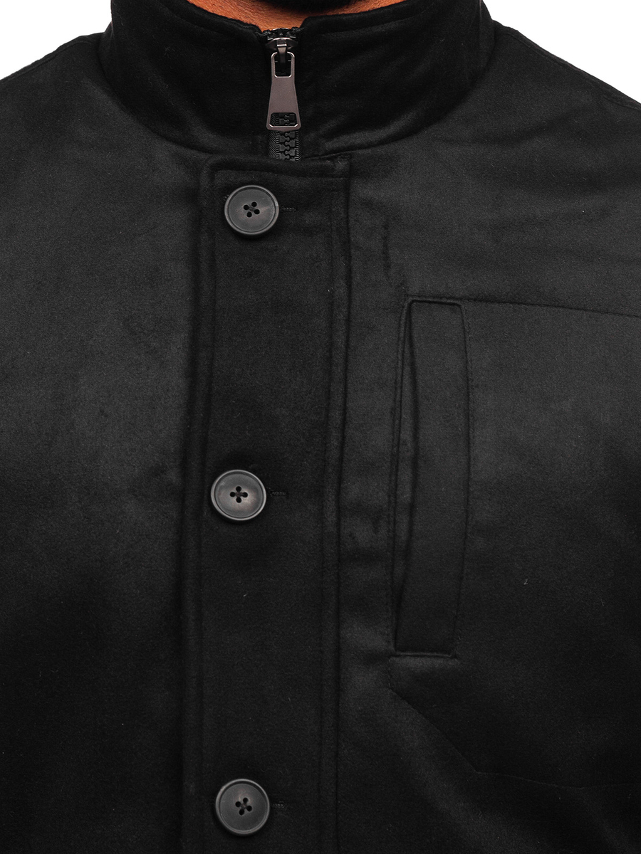 Black men's winter coat with a stand up collar M3129 from the Bolf collection. It is fastened with a zipper and buttons. It has a stand-up collar, two outer pockets and one on the chest. Additionally, it has one more inside pocket. A decorative element is a decorative clasp with buttons on the sleeves. The coat looks great both fastened and unbuttoned. It is made of high-quality fabric. It is very original, but also has a timeless elegance. Perfect for styling with chinos, a shirt and a jacket, as a more formal outfit. You can pair it with jeans and a jumper to create a cooler look for an evening walk.