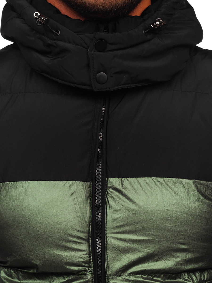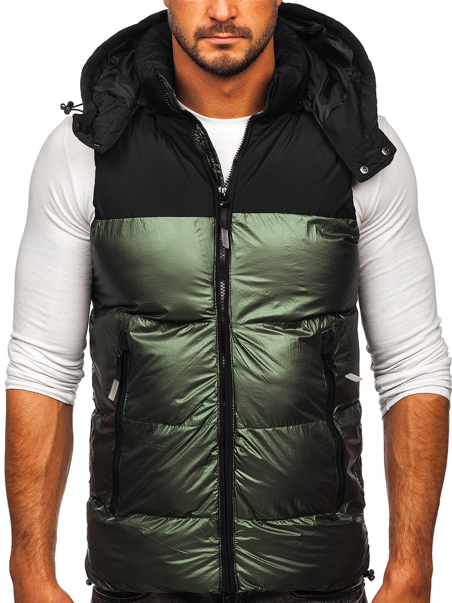 Fantastic green men's quilted hooded gilet 13079 from the Bolf collection. The vest has a zipper, a detachable hood and a stand-up collar - thanks to such elements, it is a very practical product. It has two outer pockets with zippers and one inner pocket, in which you can safely store the most necessary things, such as a phone, wallet or documents. The vest is available in several colors, it has a sporty, simple cut. The vest will be perfect for men who like sports activities. You will also use it on a daily basis during a trip to the city, meeting friends or an evening walk. Create a perfect match with a long sleeve top or joggers. It will be perfect in combination with a sweatshirt and jeans.