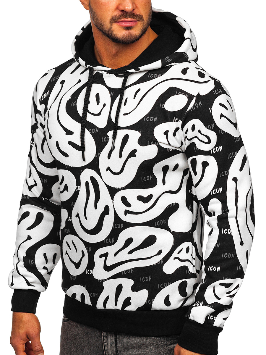 Perfect white men's printed hoodie 141032 from the Bolf collection. The sweatshirt has an adjustable, two-layer hood. Two side pockets give it a practical character. The sleeves and the bottom are finished with a welt that provides protection against the cold. It was made of 70% cotton and 30% polyester. This model has original, decorative prints in white and is available in several fashionable colors. A hoodie will work at any time of the year and in all circumstances. Put it on during sports activities, a walk or a city trip. Combine it with sweatpants and a lightweight jacket for a sporty look. For a city trip, it will go great with jeans, cargo pants or joggers.