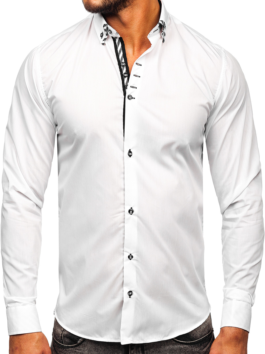 Exceptional white long-sleeved slim fit shirt from the Bolf collection. It boosts up the outfit and look great together with jeans or beige chinos. The presented model has got an interesting collar and a decorative fastening. Wear it under a blazer.