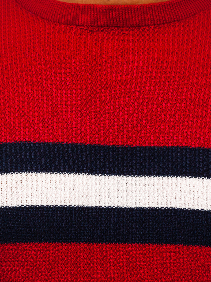 Classic red men's jumper H2113 from the Bolf collection. It is available in several color versions, which gives a great opportunity to match it to your styling. Straight-cut sweater with a round neckline, fits every figure. The product is made of 60% acrylic, 30% wool and 10% elastane, which makes it very pleasant to touch and extremely comfortable. Thanks to the original stripes made of combined materials, the sweater has acquired a casual style. Its versatility can be used in many circumstances. Perfect for sports styling, for active men and complement many everyday styling. For going out with friends, compose your perfect set with jeans, a zip up hoodie or a denim jacket.