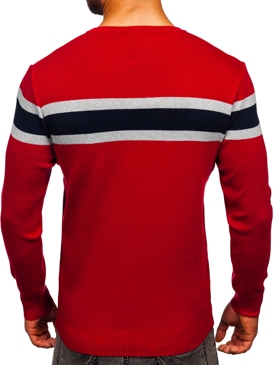 Universal red men's jumper H2108 from the Bolf collection. It is available in several color versions. It has a round neckline, finished with a welt. The ribbing is also finished at the bottom and sleeves, thanks to which the sweater fits the body perfectly. Very good quality material, gives a great sense of comfort, comfort and warmth while wearing. A striped sweater made of combined materials will be perfect for colder days. Put it on for work, shopping or for a walk. The timeless style of the product allows you to create many interesting styles. You can wear a classic sweater for any occasion. Combine it with a shirt and chinos for the perfect outfit for work. Wear jeans and a T-shirt to create a style that is perfect for meeting friends.