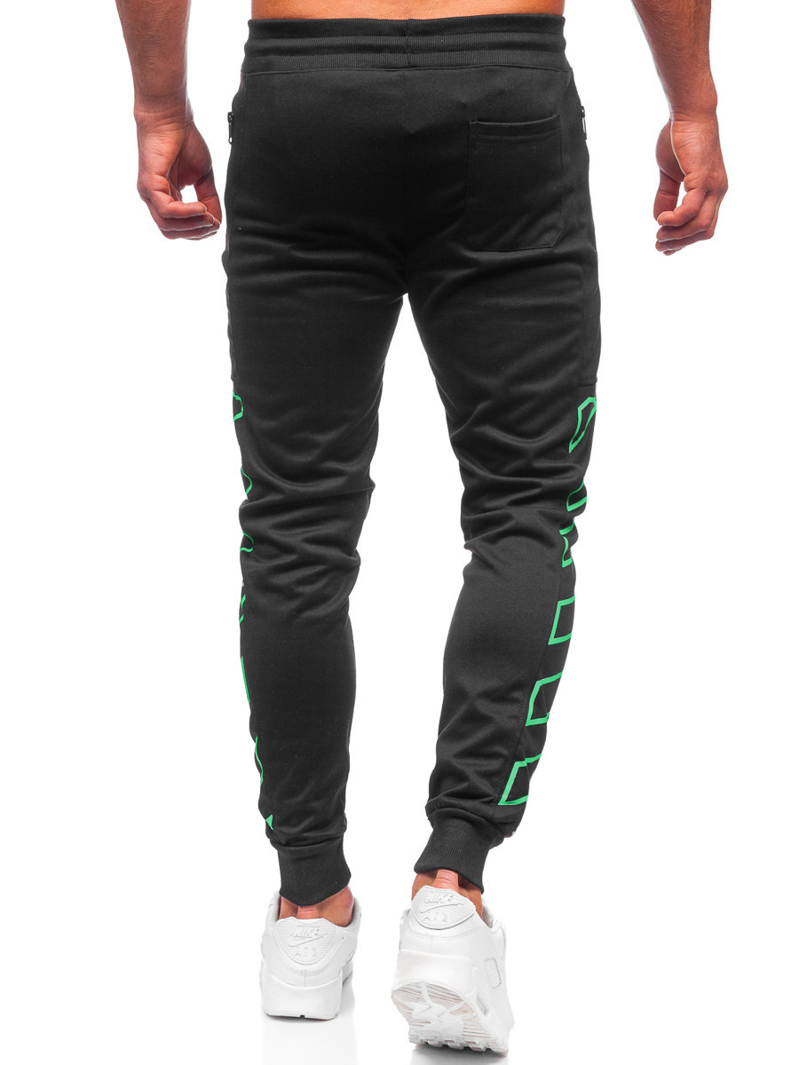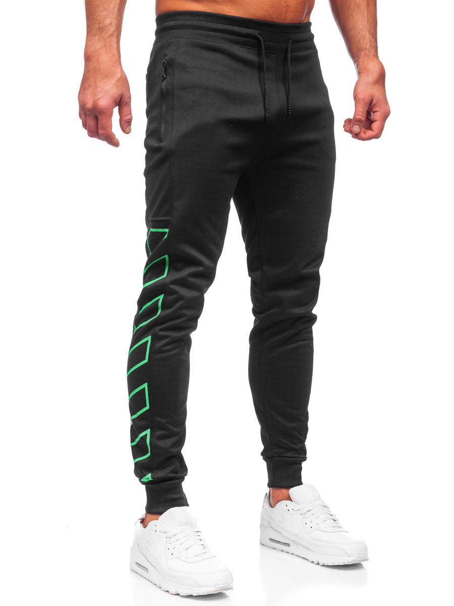 Nice black men's sweatpants HL9161 from the Bolf collection. The pants are adjustable at the waist with a strong welt and drawstring, so you can adjust them to fit your figure perfectly. Pants have two pockets, fastened with a zipper. Additionally, they have one unfastened pocket on the back. A simple cut and cuffs at the legs give them a sporty look, which at the same time provide warmth on colder days. This model is distinguished by a decorative print on the legs. The fabric is soft and pleasant in touch providing great fitting. You can put them on in the gym, go for a walk or meet friends. Perfect for a sweatshirt and a T-shirt creating a sports outfit.