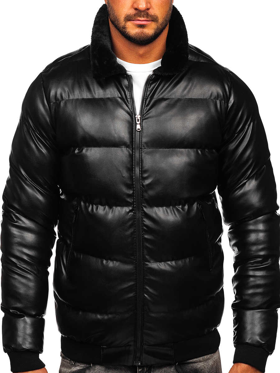 Black men's quilted leather winter jacket 0022 from the Bolf collection - perfect on cold days. Winter jacket made of ecological leather, has a collar with decorative fur that will protect you against wind and cold. The product has three pockets, two outside and one inside pocket, all zippered, so you can safely hide your phone, wallet or documents. Bottom and sleeves finished with a welt, thanks to which it fits nicely to the body. Very good quality material gives a sense of comfort, convenience and warmth while wearing. You can wear it to school, work or shopping. For a meeting with friends, pair a jacket with a long sleeve top and jeans. By combining the product with a sweater and joggers, you will get the perfect look for colder days.