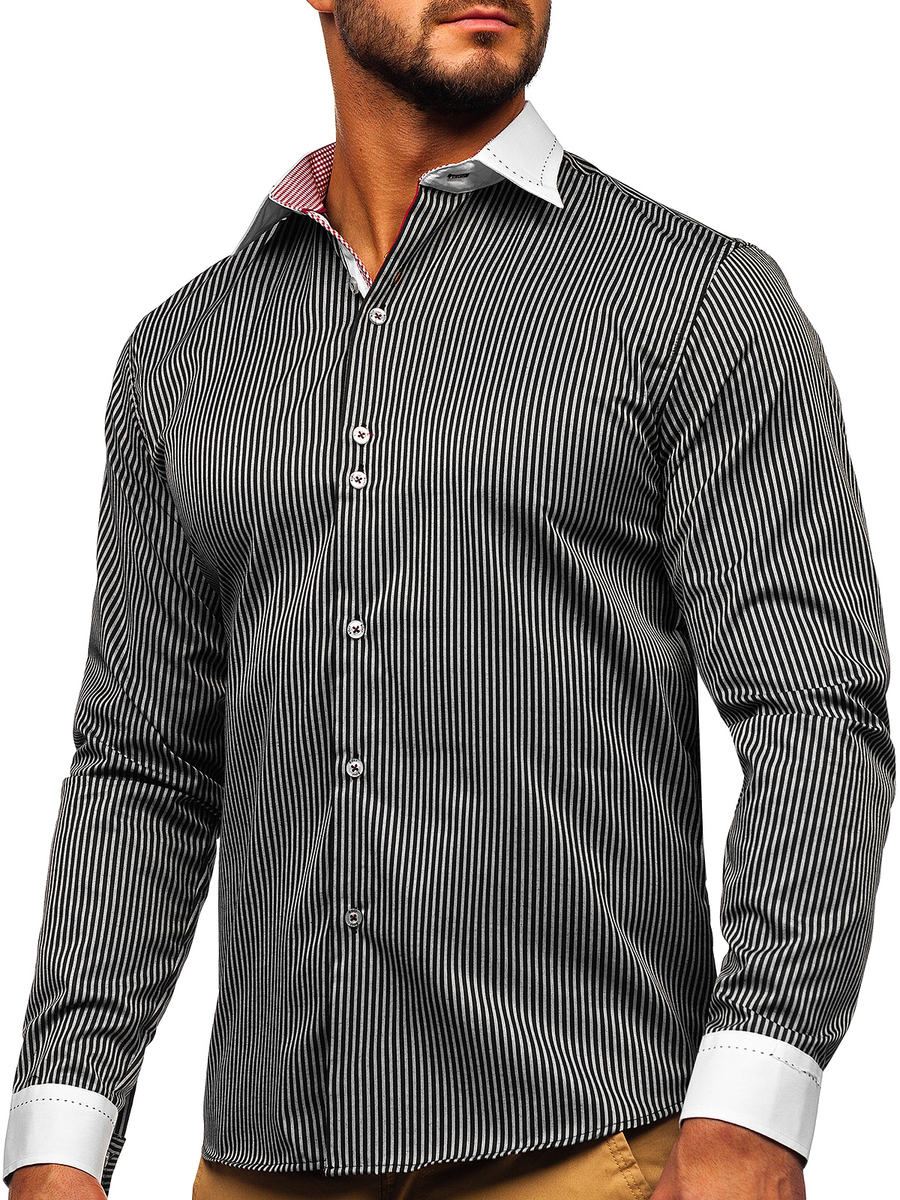 Fantastic black men's striped shirt from the Bolf collection. The presented model is slim fit and looks great in various outfits. Match it with chinos in stylish outfits. Wear it also with jeans.