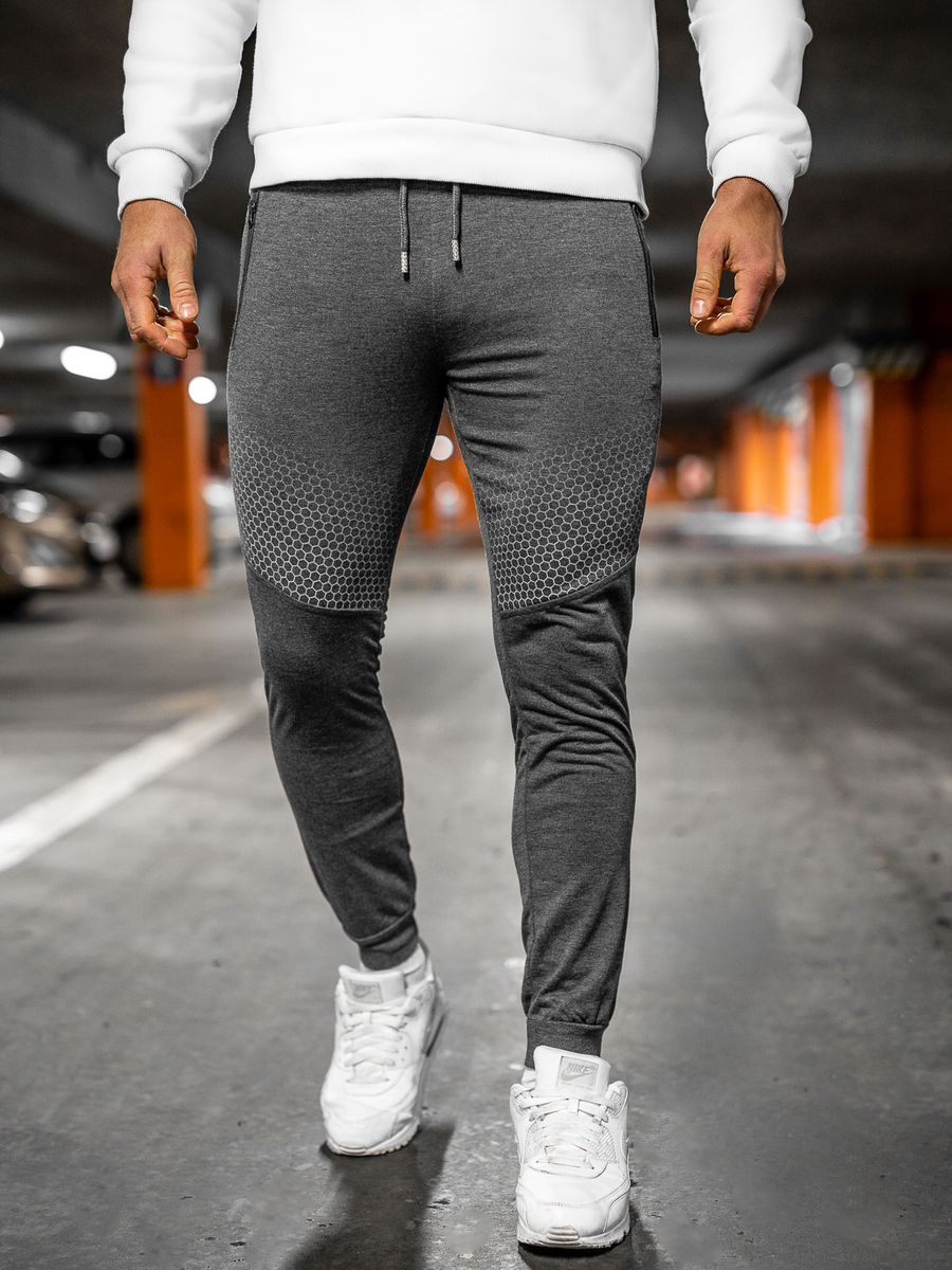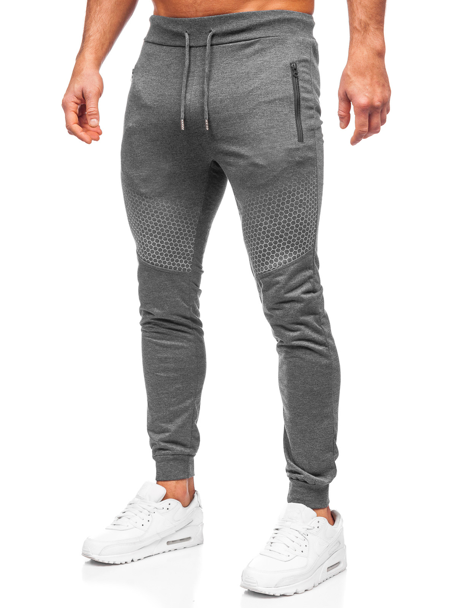 Nice graphite men's sweatpants HW2351 from the Bolf collection. The pants are adjustable at the waist with a string and a strong welt, thanks to which you can adjust them to perfectly fit your figure. There are two zippered pockets on the front and an additional pocket on the back. A simple cut and cuffs at the legs give them a sporty look, which at the same time provide warmth on colder days. This model is distinguished by decorative prints on the legs. The fabric is soft and pleasant in touch providing great fitting. You can put them on in the gym, go for a walk or meet friends. Combine them with a leather jacket and a long sleeve top for an urban look. Perfect for a sweatshirt and a T-shirt creating a sports outfit.