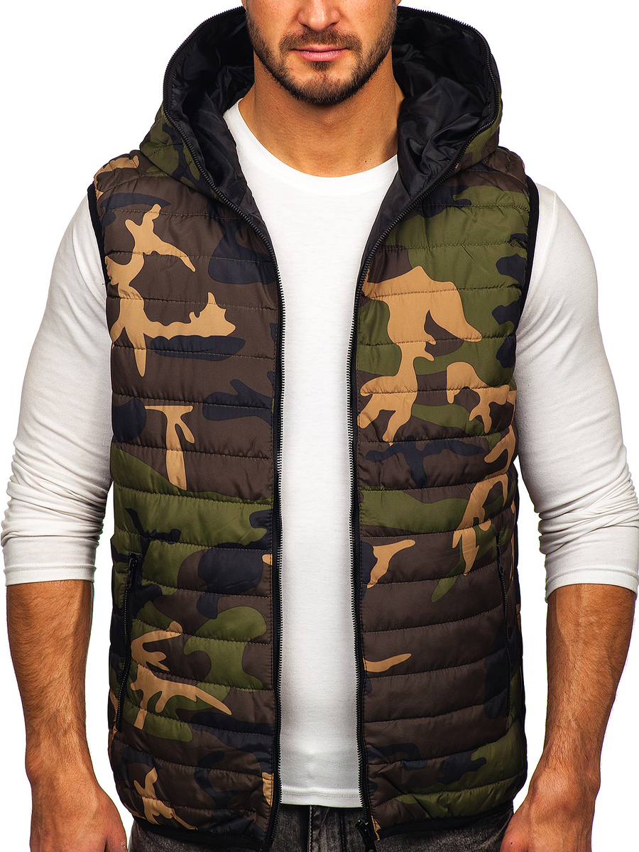 Fantastic khaki men's quilted gilet with a hood 7106 from the Bolf collection. This classic-cut gilet will be a great alternative to a jacket in the fall season, providing protection against the cold and wind. The fashionable camo motif adds character to it. It is fastened with a zipper and has an adjustable hood. Two outer pockets with zippers add practical character. It also has two inside pockets without fastening. The bottom is finished with an elastic trim. It is made of 100% polyester. The gilet can be used as a basis for many fashionable stylings, it will successfully replace a lightweight jacket. It will look great in combination with sweatpants creating a sporty, loose outfit. It fits perfectly with jeans and joggers.