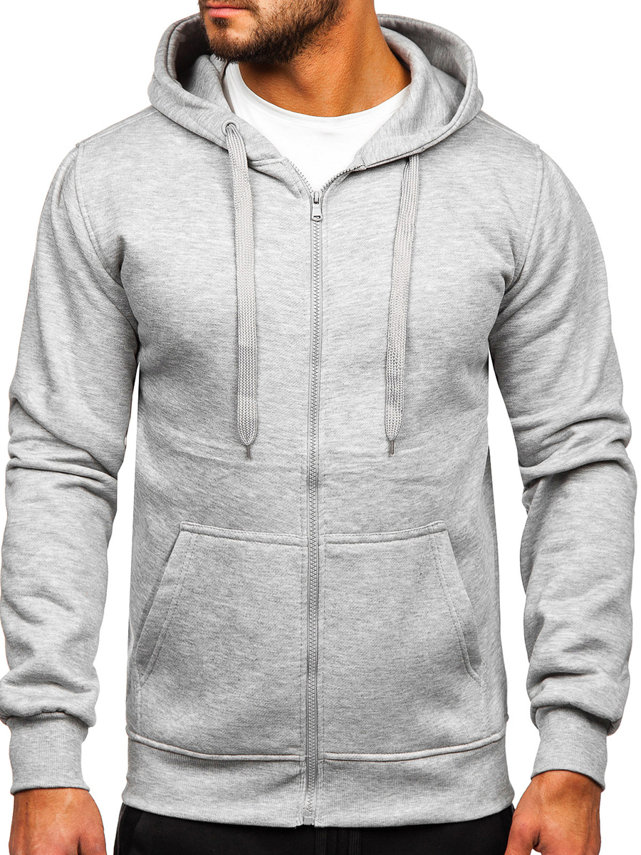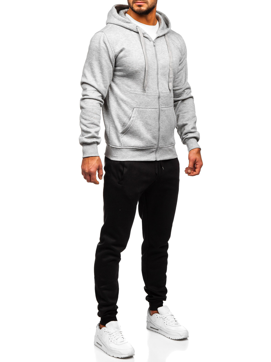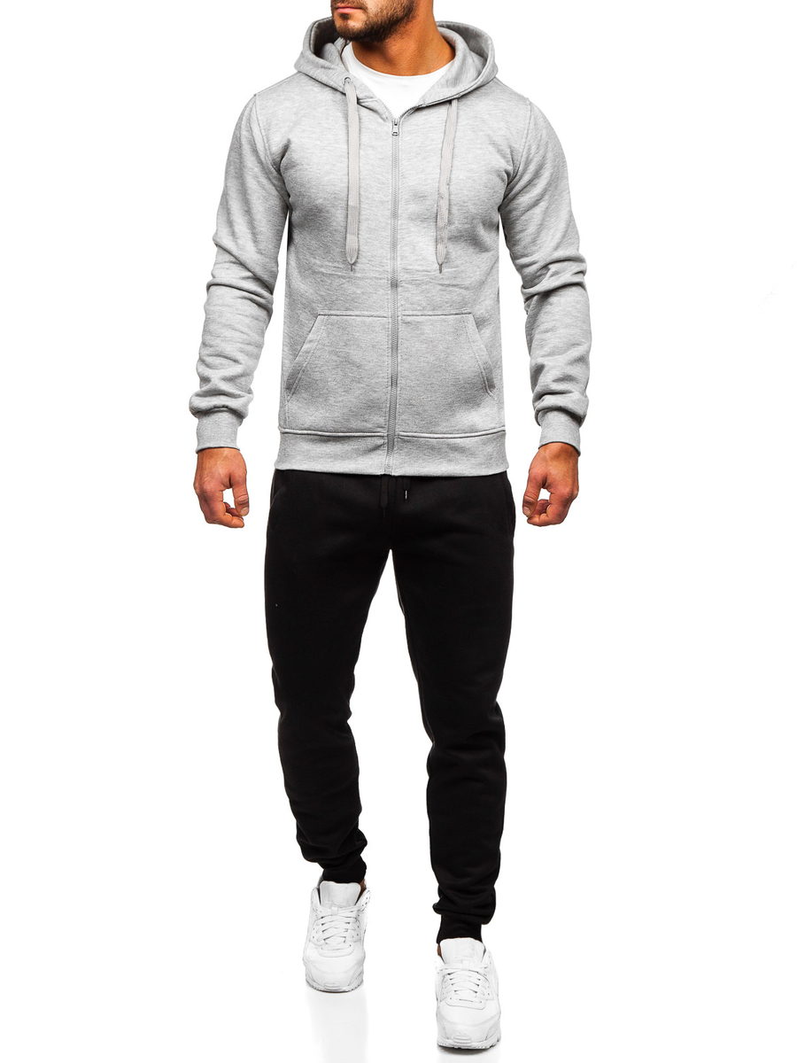 Outstanding grey men's tracksuit with a zip hoodie D004 from the Bolf collection. The set includes a hoodie and sweatpants. Sweatshirt with a classic cut, fastened with a zipper. It has a practical hood and two side pockets. The bottom and sleeves of the sweatshirt are finished with a welt, which provides warmth and protection against wind on colder days. The pants are adjustable at the waist with a strong welt and drawstring, and two pockets on the sides. A simple, fitted cut gives them a sporty look. It was made of a soft and pleasant in touch fabric. A tracksuit set can be a universal base for building everyday or sports outfits. It is available in a dozen or so different color versions. Thanks to a wide range of colors, you will not only choose something for yourself, but also match the tracksuit to your styling every day. The set will perfectly match a T-shirt with a lightweight jacket or a sports jacket.