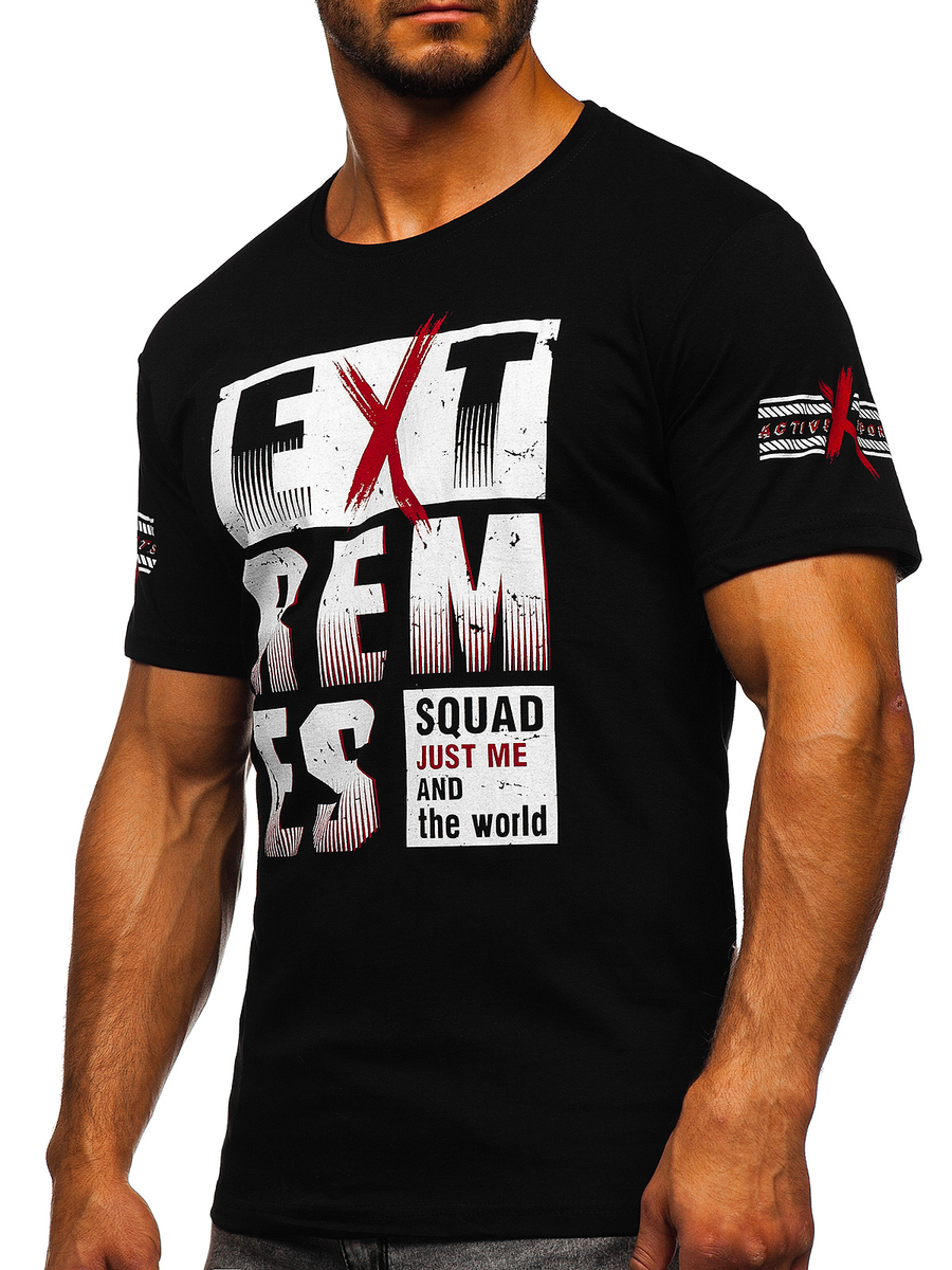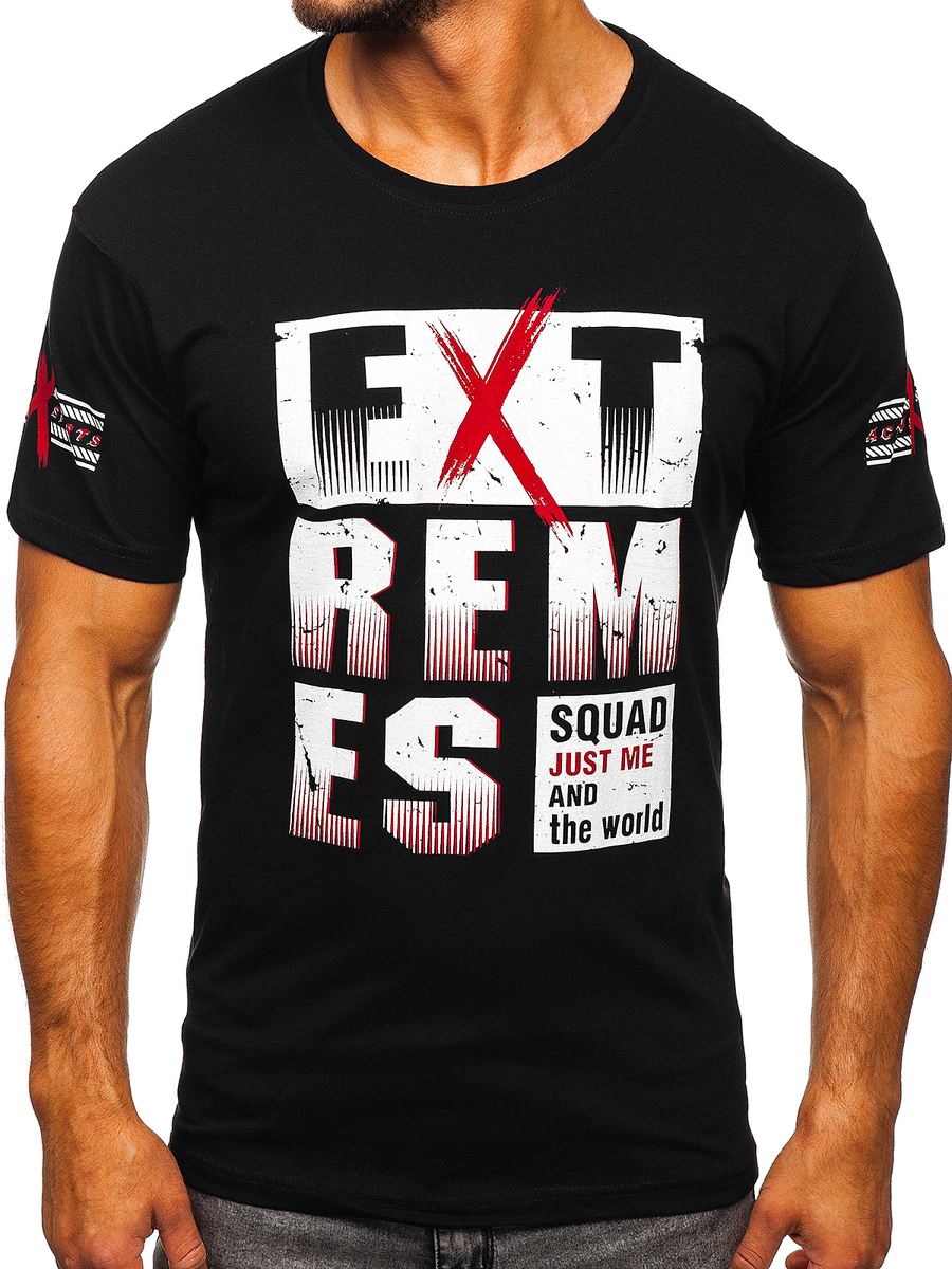 Classic black men's printed T-shirt 14312 from the Bolf collection. Straight-cut T-shirt with a round neckline fits every figure. Thanks to the original print on the front, the t-shirt will add an original look to any styling. It was made of 100% cotton. Thanks to its versatility, you can create many fashionable styles with it. Perfect for both sports and everyday outfits. Combine a t-shirt with sweatpants and a gilet for the most fashionable, sporty look.