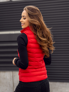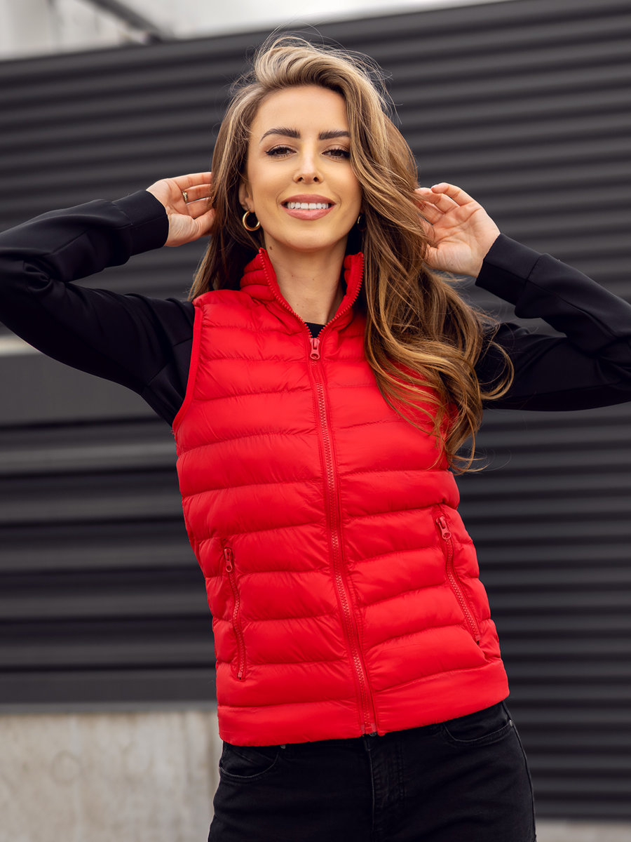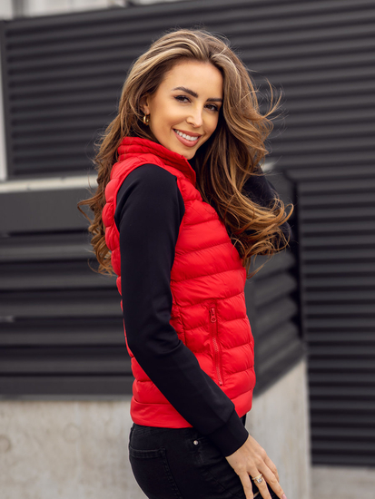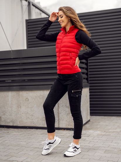 Fantastic red women's quilted gilet 23077 from the Bolf collection. This classic quilted gilet will be a great alternative to a jacket in the fall season, providing protection against cold and wind. There is a zip fastening and a stand up collar. Two outer pockets with zippers give it a practical character. It is made of 100% nylon, so you will feel extremely comfortable in it. It will look great in combination with sweatpants creating a sporty, loose outfit. Jeans fit just perfectly. You can wear it on a sweatshirt or a T-shirt!