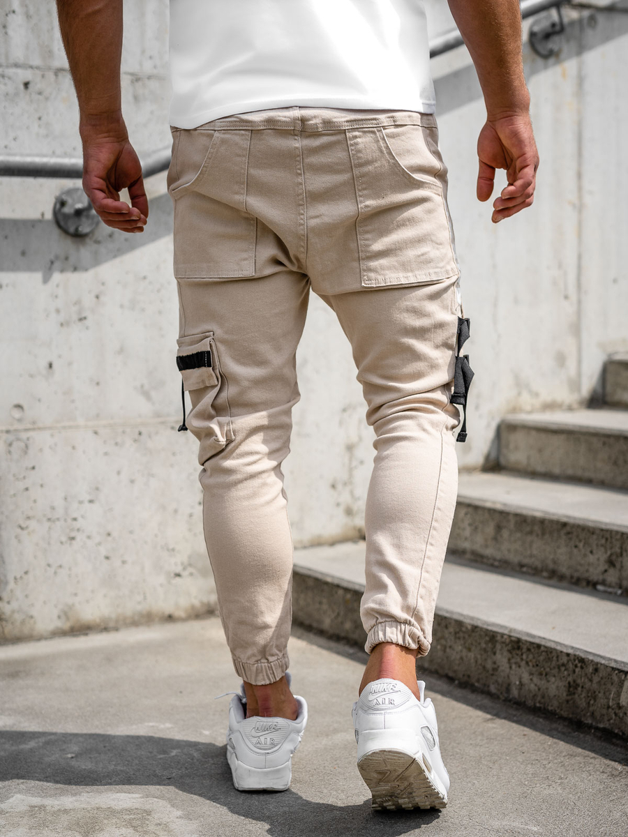 Fantastic beige men's cargo joggers 6685 from the Bolf collection. Thanks to the adjustment at the waist with a strong welt and a string, you can perfectly match them to your figure. They have two outer pockets without fastening and two side pockets with a flap. In addition, there are two more pockets on the back without fastening. Thanks to such a large number of practical pockets, you will always have everything you need with you! The legs are finished with a welt, thanks to which they not only look aesthetically, but also protect against cold and wind. This model has decorative fasteners on the side pocket that will appeal to fans of unusual stylizations. Joggers will look great in both summer styles with a T-shirt and winter styles with a warmer jacket.