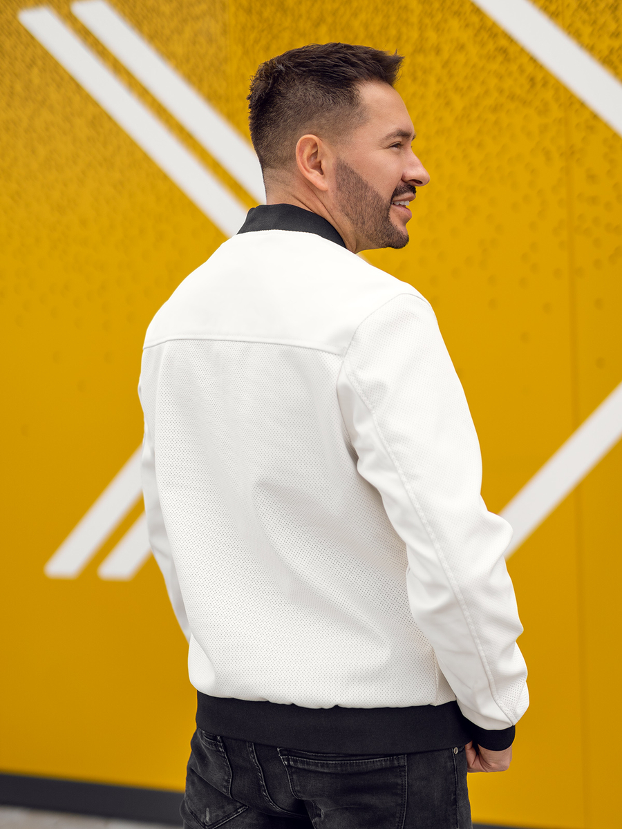 Eye-catching white men's leather jacket 7110 from the Bolf collection. It is fastened with a zipper and has a stand-up collar finished with a welt. Two outer pockets with zippers and one inner pocket give it a practical character. The bottom and sleeves are finished with a ribbing to keep you warm and windproof. The leather jacket has a universal cut and is in a casual style, making it suitable for any occasion. It is made of two combined faux leather materials. It will look great with joggers, jeans or in a more casual style with sweatpants.