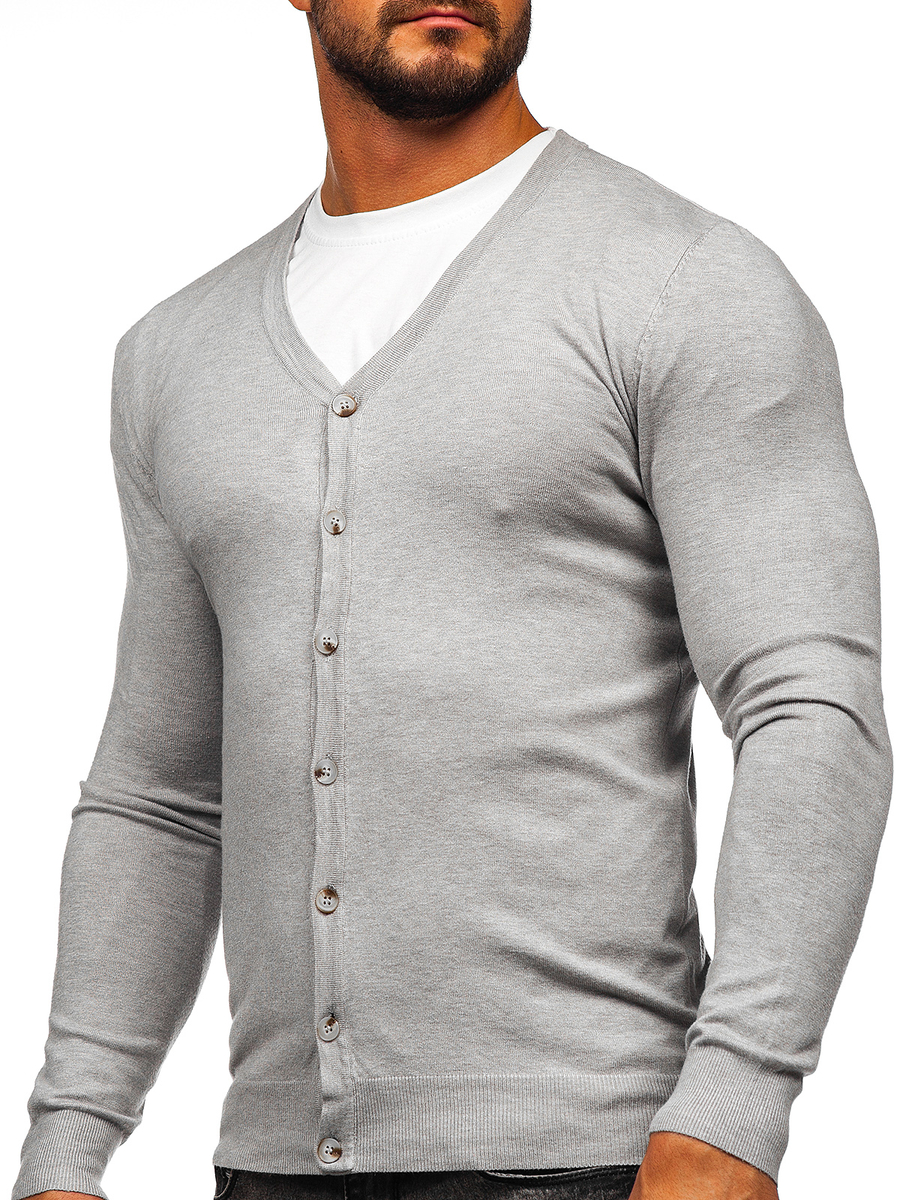 Classic grey men's cardigan MM6006 from the Bolf collection. It comes in several unique color shades. It is fastened with buttons and its bottom, neckline and sleeves are finished with a welt, thanks to which it fits perfectly to the body. Cardigan will be perfect for colder days. Put it on for work, shopping or for a walk. The timeless style of the product allows you to create many fashionable styles with it. With a casual cardigan you can create contact sheets for every occasion. Put on your T-shirt, jeans, a coat and enjoy the mega fashionable look!