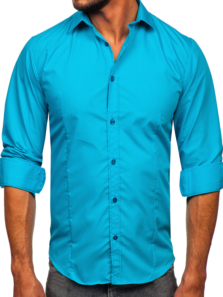 Elegant light turquoise men's long sleeve shirt 1703 from the Bolf collection. The presented model comes in different colours. Plain men's shirts are recommended for fans of minimalism and classic elegance in fashion. It provides great comfort and fitting. A definite must-have in the wardrobe of a conscious businessman. The design is straight and fits to various stylings. Shirt with a slim fit cut, buttoned, has a practical rounded hem. The sleeves are finished with wide, adjustable cuffs that are fastened with one button. It has a classic collar with short lapels. It will surely meet your expectations regardless of the colour. Choose from many beautiful colours. Shirts will work in many formal and semi-formal compositions, in all circumstances. Business meeting? Date? Party? For each of these occasions, it is worth wearing a plain Bolf shirt. This model can be matched with jeans, joggers, a bomber jacket or a classic leather jacket. Wear it with chinos, a blazer or a suit. Add a classic bow tie or a tie. The Bolf 1703 shirt is the flagship product of the brand. It is also one of the Bolf sales hits, for years it has been in the TOP 10 shopping choices of our customers who are willing to come back for new color versions of the product. Exceptionally good price and great workmanship are other advantages of the shirt.