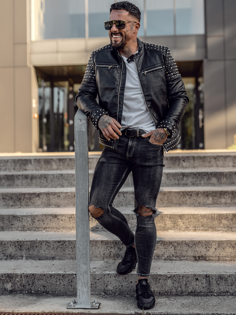 Perfect black men's leather jacket with studs 11Z8007. It is fastened with a zipper and has a stand-up collar. This mega fashionable leather jacket is decorated with studs, and its sleeves are finished with a decorative zipper, thanks to which it will definitely make you stand out from the crowd! The fitted and simple cut makes everyone look exceptionally advantageous in it. It has practical pockets: two side pockets and two chest pockets with zippers. The jacket also has an additional inside pocket, without fastening. Thanks to its versatility, the product can be combined with many styles. It will create a perfect combination with both jeans, tracksuits or chinos.