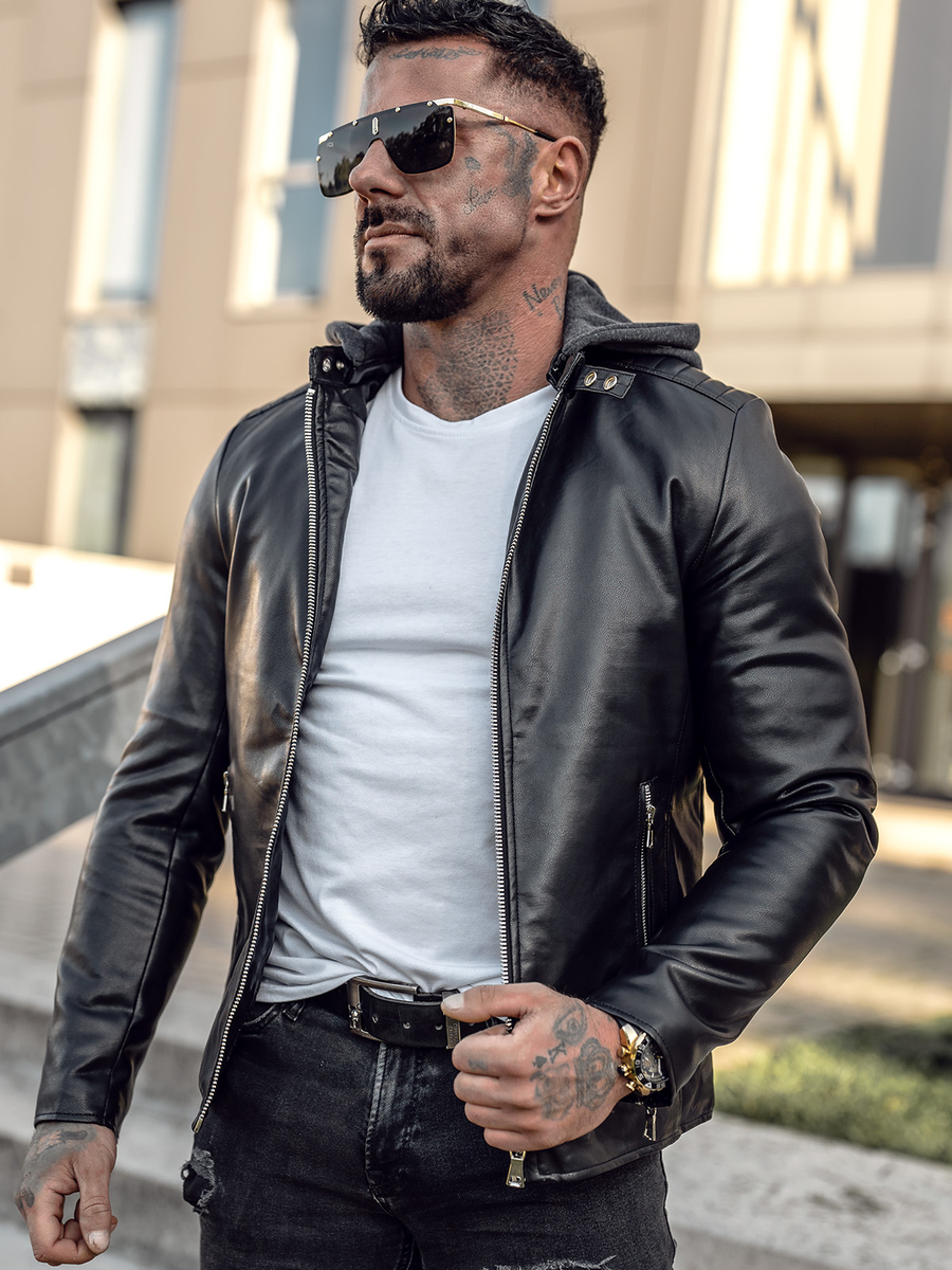 Classic black men's leather biker jacket with a hood 11Z8012 from the Bolf collection. Fastened with a zipper, it has a stand-up collar fastened with press studs. Practical, detachable hood imitating a sweatshirt is a fashionable diversion. Two pockets with zippers and an inside pocket give it a practical character. Fashionable and distinctive zippers on the sleeves are decorative elements. The leather jacket has a universal, timeless cut and is in a casual style. It will look great with joggers, jeans or in a more casual style with sweatpants.