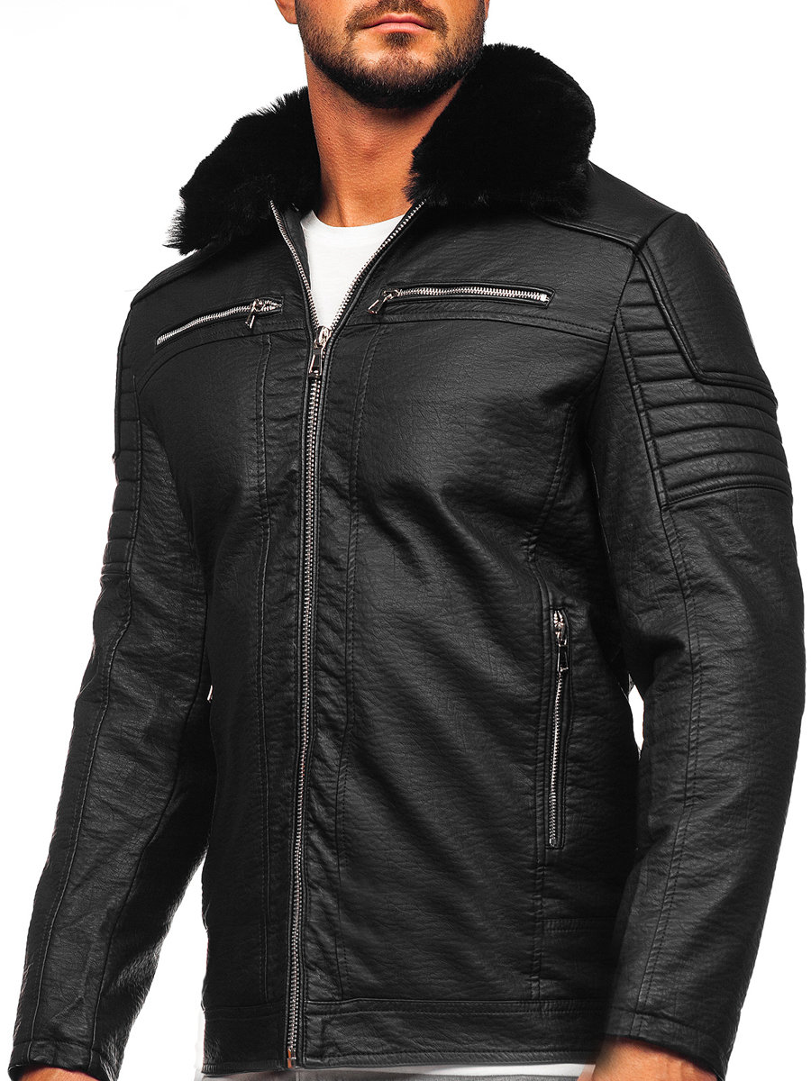 Classic black men's leather jacket with a fur 11Z8013 from the Bolf collection. Made of ecological leather, fastened with a zipper. The biker jacket has fashionable material combinations that distinguish it from other proposals! Decorative zippers on the sleeves and detachable fur give it a unique look. The jacket has practical outer pockets with zippers and an inner pocket. The casual style of the jacket allows you to create many interesting styles with its help. Do you bet on the classics? Combine a biker jacket with jeans and a T-shirt!