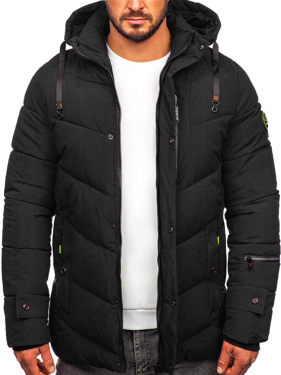 Classic black men's quilted winter jacket 22M55 from the Bolf collection. Warm, winter jacket has a detachable, adjustable hood with press studs. The jacket is fastened with a zipper and press studs. It has a front pocket and side pockets with zippers in which you can safely hide your phone, wallet or gloves. In addition, there is a small zippered pocket on the sleeve. The cuffed sleeves are additionally adjustable with velcro. A quilted jacket will be perfect for everyday styling. Do you want to stand out? Match your quilted jacket with trendy jeans and a sweatshirt with a designer print!
