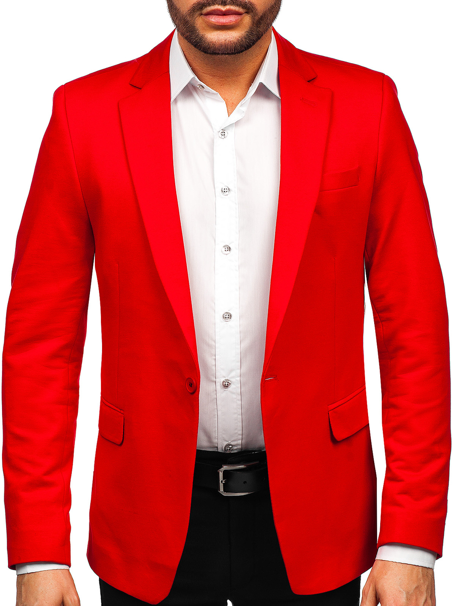 Outstanding red men's casual blazer 1652A from the Bolf collection. It is a classic single-breasted blazer fastened with one button. The slim fit cut, beloved by our customers, adapts to the figure. It has a breast pocket and a single vent at the back. Its two side pockets with a flap and two inside pockets add to its practicality. Decorative buttons on the sleeves add character to it. The product is available in three versions. A casual blazer is a must have! Compose your elegant look with chinos and a shirt. For a more casual outfit, choose jeans and a coat.