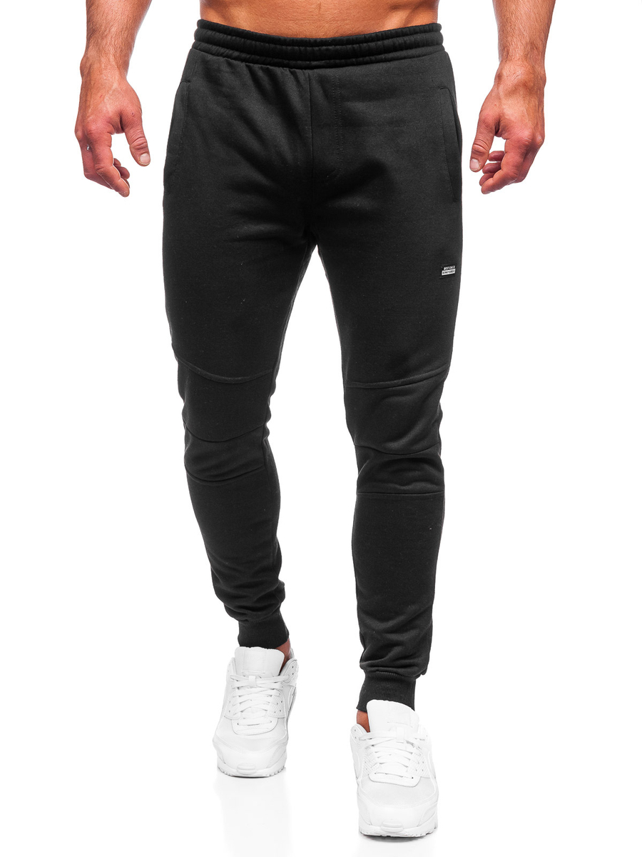 Nice black men's sweatpants KK2231 from the Bolf collection. They are adjustable at the waist with a drawstring and a strong welt, thanks to which you can adjust them so that they perfectly fit your figure. The pants have two pockets on the front. A simple cut and cuffs at the legs give them a sporty look, which at the same time provide warmth on colder days. This model is distinguished by fashionable, material stitching on the legs. The fabric is soft and pleasant in touch providing great fitting. You can put them on at the gym, going for a walk or meeting with friends. Match them with a sweatshirt and a T-shirt.