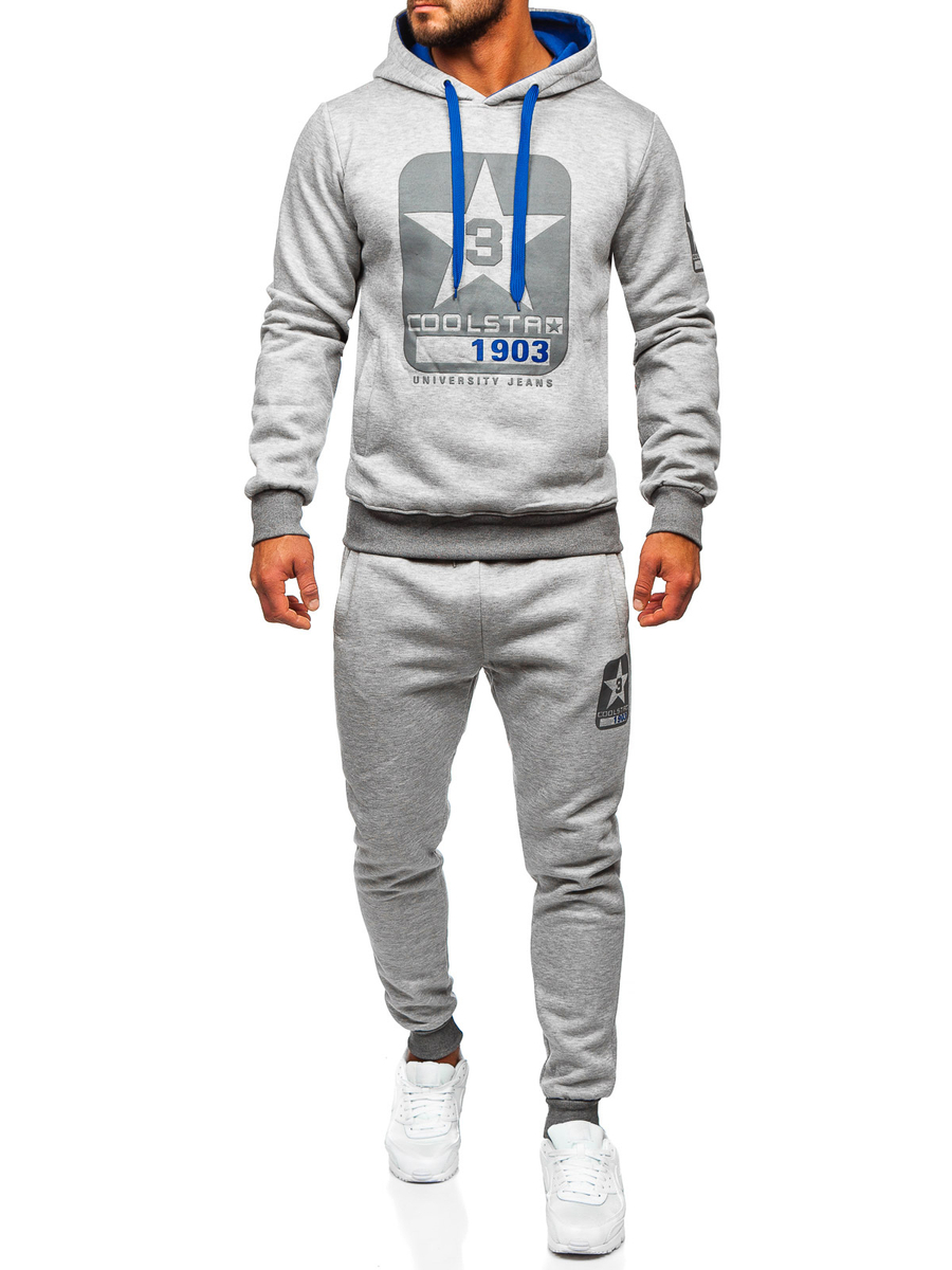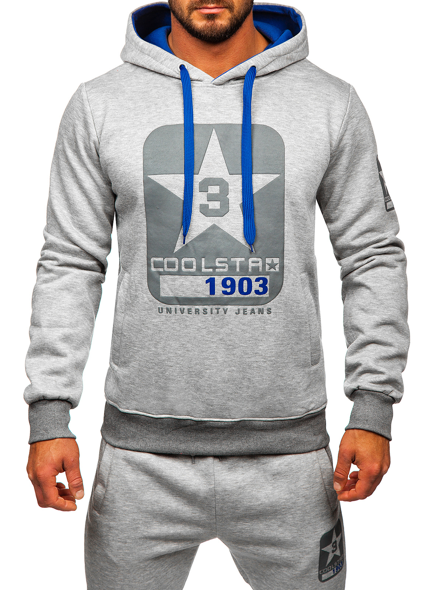 Must have grey men's velour tracksuit with a hood 8C59 from the Bolf collection. The sweatshirt has two external pockets, an adjustable hood and the bottom and sleeves are finished with a welt. The pants are adjustable at the waist with a strong welt and drawstring and two pockets. A simple, fitted cut gives them a sporty look. It was made of a soft and pleasant in touch fabric. Both the sweatshirt and pants can be combined with other items of clothing, thus obtaining many possibilities for creating everyday stylizations. The set will perfectly match a T-shirt, a gilet or a down jacket. Sweatsuits are recommended to be worn at home, on a walk, while shopping, or during sports in the gym or outdoors.