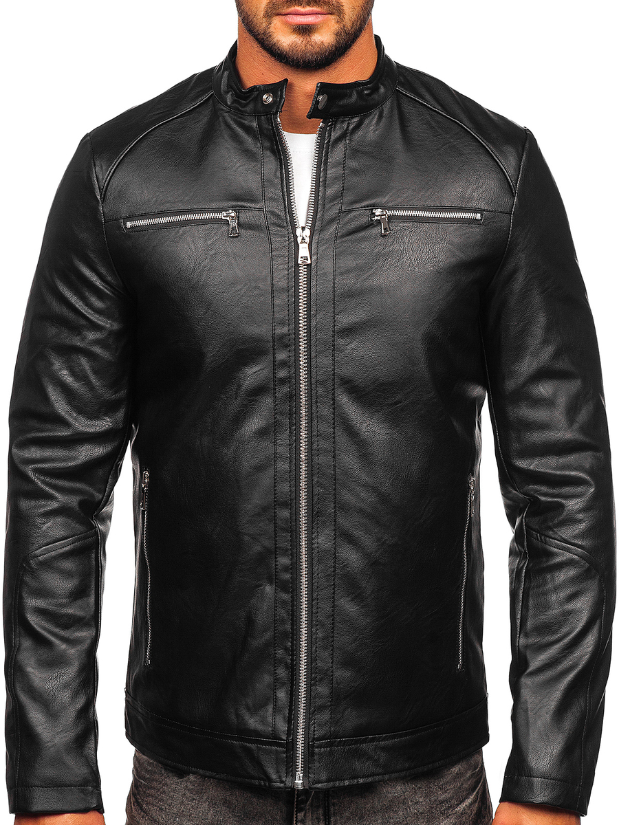 Classic black men's leather jacket 11Z8003-A from the Bolf collection. The jacket is fastened with a zipper, has a stand-up collar fastened with a snap. This super fashionable leather jacket has practical pockets: two side pockets and two chest pockets fastened with a zipper. The jacket also has an additional internal pocket, without a fastener. The fitted and simple cut makes everyone look exceptionally good in it. Thanks to its versatility, the product can be combined with many styles. It will create a perfect combination with jeans, a tracksuit or chinos.