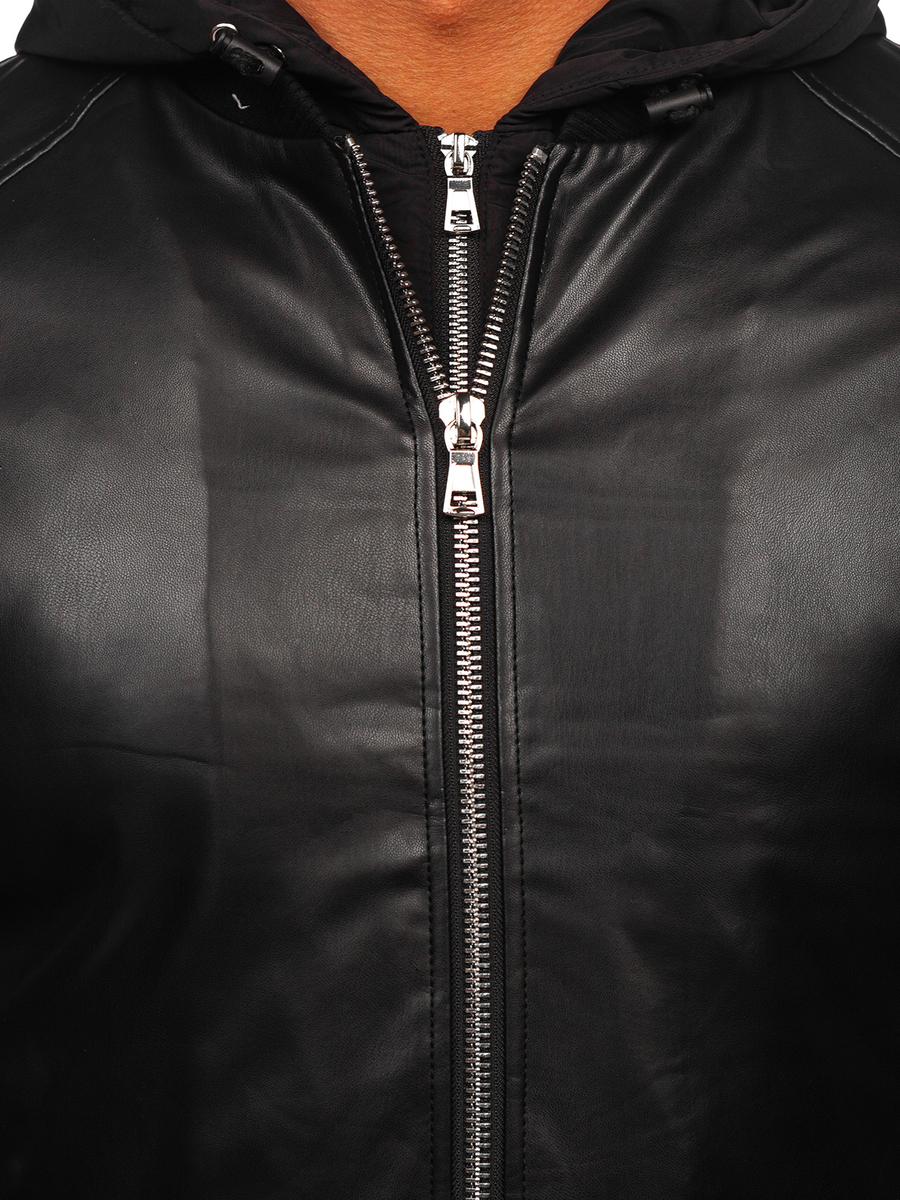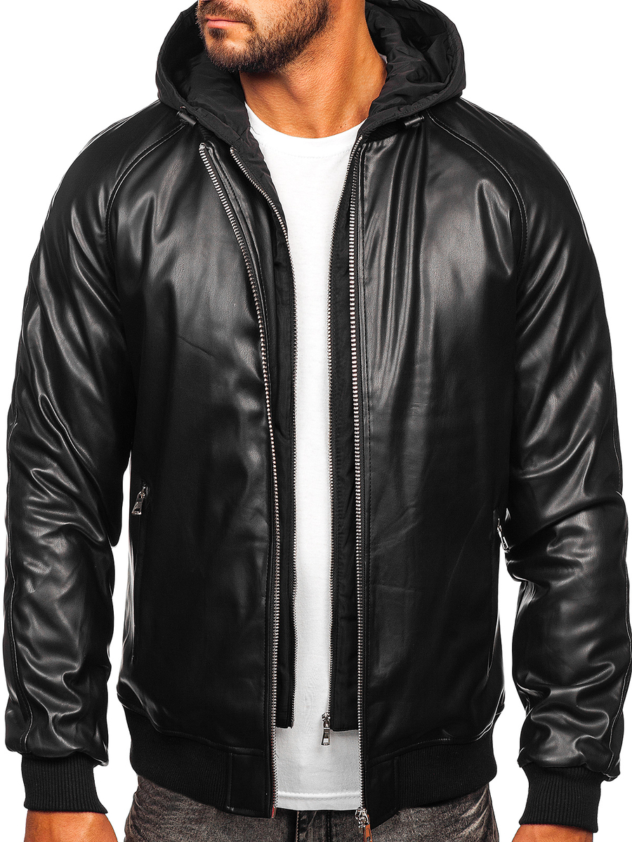 Classic black men's leather bomber jacket 11Z8004 from the Bolf collection. The jacket is fastened with a zipper, has a detachable insert with an adjustable hood. This mega fashionable leather jacket has two outer pockets with zippers and an additional inner pocket, without a fastener. The bottom, sleeves and a practical stand-up collar are finished with welt. The fitted and simple cut makes everyone look exceptionally advantageous in it. Thanks to its versatility, the product can be combined with many styles. It will create a perfect combination with both jeans, tracksuits or chinos.