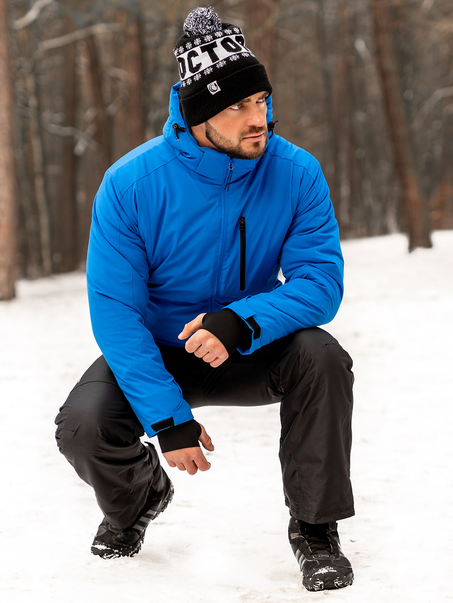 Classic blue men's winter sport jacket HH011 from the Bolf collection. A winter jacket with a hood will suit every taste. The product is fastened with a zipper and a zipper. The hood is removable and has a 2D adjustment. A high collar with a zipper will provide excellent protection against the cold. A practical element of the jacket are pockets: two side zippered, the chest also zippered and two inside pockets, one fastened with Velcro. The sleeves are adjustable with Velcro, from the inside finished with an elastic welt with a thumb hole. The product is universal, it will be perfect for training, walking, going out into the city or hiking in the mountains. It is made of 94% polyester and 6% elastane. It will look great with jeans or sweatpants.
