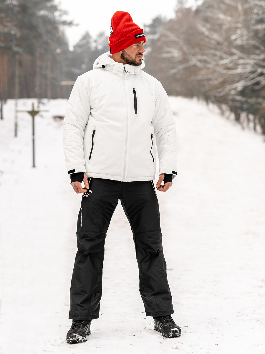 Classic white men's winter sport jacket HH011 from the Bolf collection. A winter jacket with a hood will suit every taste. The product is fastened with a zipper and a zipper. The hood is removable and has a 2D adjustment. A high collar with a zipper will provide excellent protection against the cold. A practical element of the jacket are pockets: two side zippered, the chest also zippered and two inside pockets, one fastened with Velcro. The sleeves are adjustable with Velcro, from the inside finished with an elastic welt with a thumb hole. The product is universal, it will be perfect for training, walking, going out into the city or hiking in the mountains. It is made of 94% polyester and 6% elastane. It will look great with jeans or sweatpants.