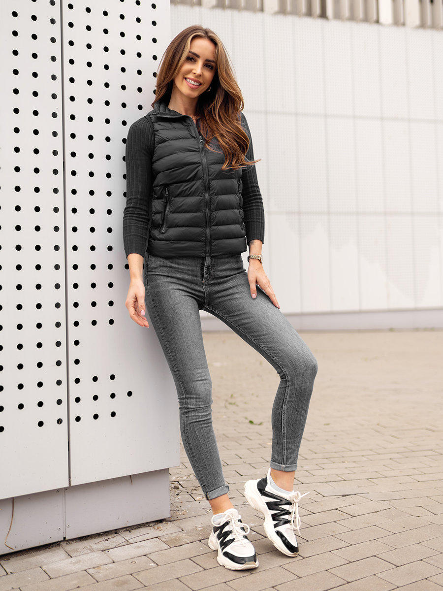 Fantastic black women's quilted gilet 23077A from the Bolf collection. This classic quilted gilet will be a great alternative to a jacket in the fall season, providing protection against cold and wind. There is a zip fastening and a stand up collar. Two outer pockets with zippers give it a practical character. It is made of 100% nylon, so you will feel extremely comfortable in it. It will look great in combination with sweatpants, creating a sporty, loose outfit. Jeans fit just perfectly. Match it also with a sweatshirt or a T-shirt!
