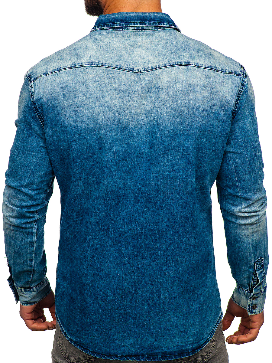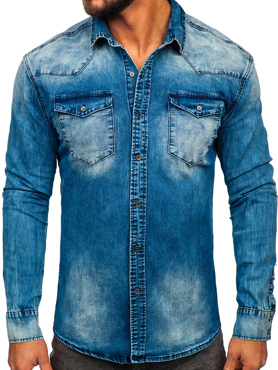 Classic men's denim shirt MC710BS from the Bolf collection. It perfectly harmonizes with elegant and casual stylizations. It can be an addition to an outfit or its main element. Matches a leather jacket and a jacket. Fastened with buttons, with adjustable cuffs. Made of 90% cotton, which makes it extremely pleasant to the touch. Available in two versions: graphite and navy blue.