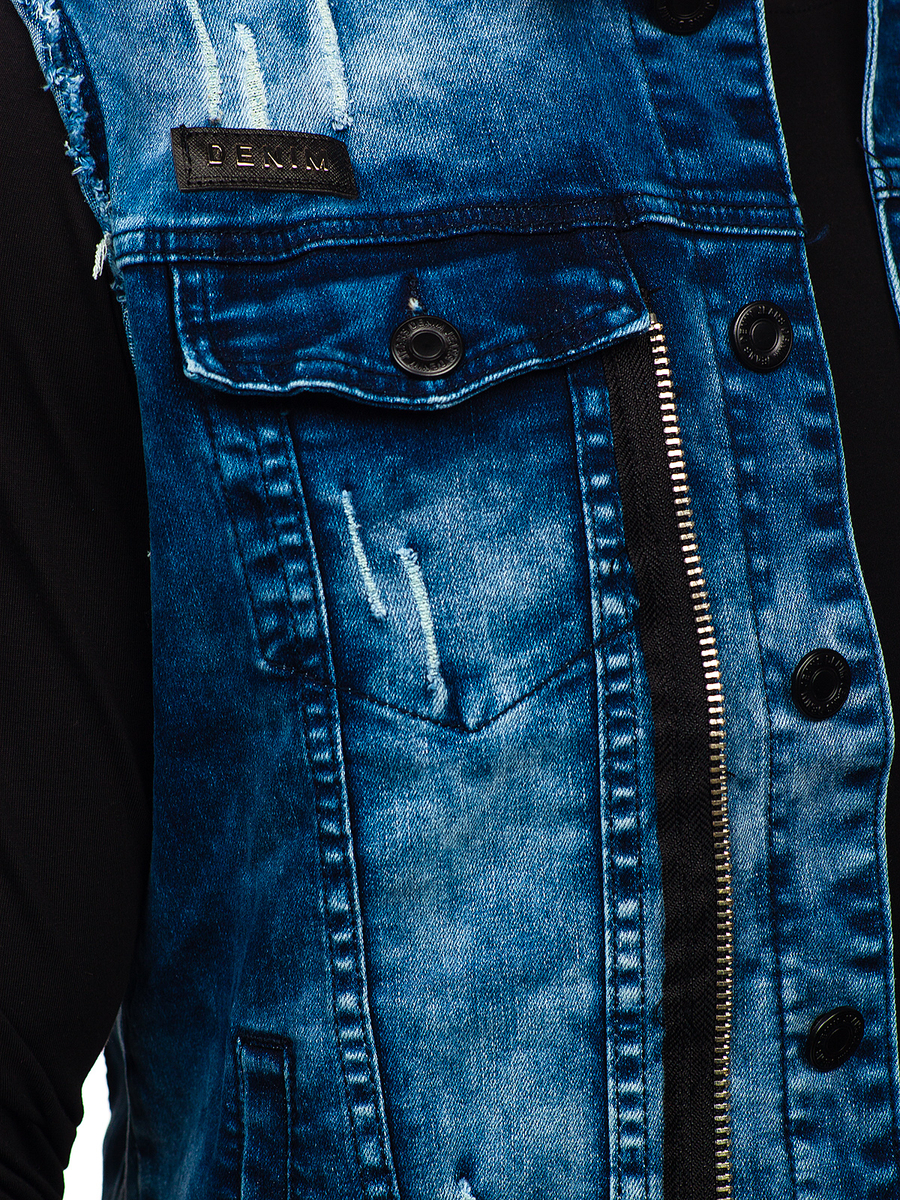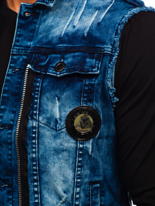 Perfect navy blue men's denim gilet G115 from the Bolf collection. Made of high quality denim, which makes it flexible, comfortable and durable. Abrasions, shading and patches on the entire surface give the jacket a fashionable, rock climate. It has a lot of capacious pockets where you can put your phone, wallet or documents. It is worth combining it with black jeans and a long sleeve top.