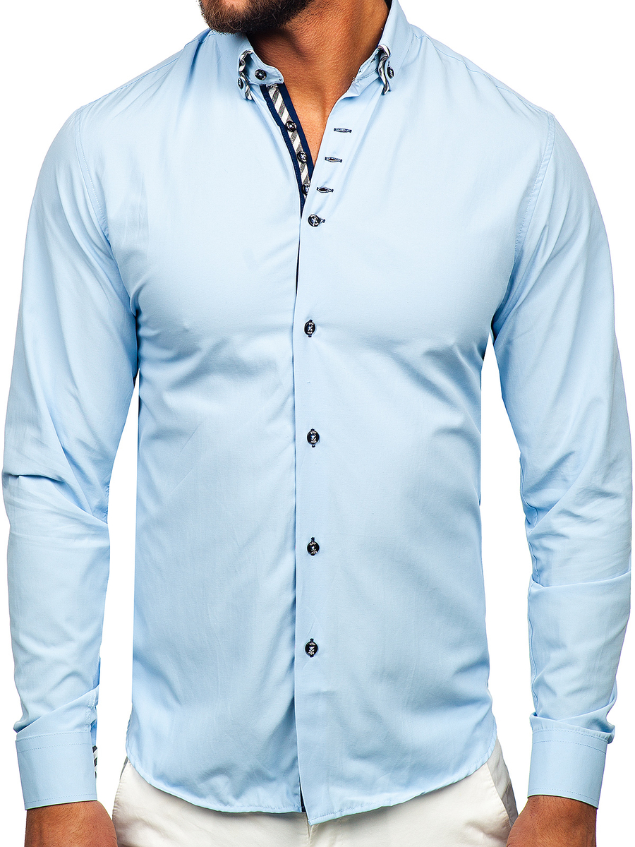 Exceptional sky blue long-sleeved slim fit shirt from the Bolf collection. It boosts up the outfit and look great together with jeans or beige chinos. The presented model has got an interesting collar and a decorative fastening. Wear it under a blazer.