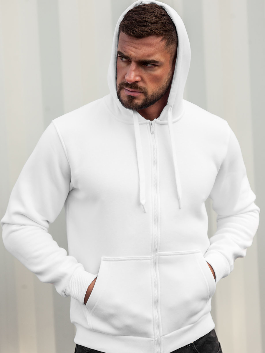White men's hoodie with a zipper 2008A from the Bolf collection. It's a classic design made of high-quality material. This model comes in different colours. It has got an adjustable hood and side pockets. The bottom and sleeves are elasticated. It is designed for those who value comfort and minimalistic style. It's very comfortable and practical. It's an absolute must have. The design is classic and fits to various stylings. It will surely meet your expectations regardless of the colour. It comes in many beautiful versions. Wear it all year long. It provides a very comfortable fit. It's suitable to wear to the gym as well as to wear it casually. Match it with jeans, a T-shirt or sweatpants and a long sleeve top. It's a Bolf bestseller item. Check out this model in the reviews of influencers and IG. Moreover, it is really affordable. It is suitable to various stylings. You can wear it with your favourite T-shirt on chilly days. Try to match it also with smart casual stylings. It fits to chinos, a shirt and a coat or sweatpants and a lightweight jacket.