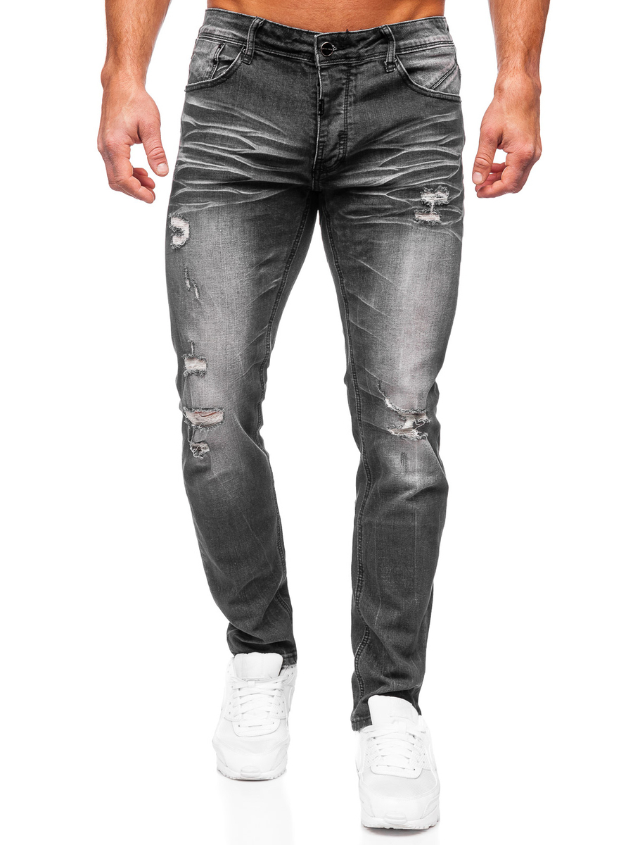Stylish black men's slim fit jeans MP0032N from the Bolf collection. The trousers will look fantastic in combination with a flannel shirt and a biker jacket. They will prove themselves in everyday stylizations, for going out with friends or on a date. They are fastened with buttons and have two pockets on the front and back. Shading and abrasions on the entire surface of the leg give them a unique character.
