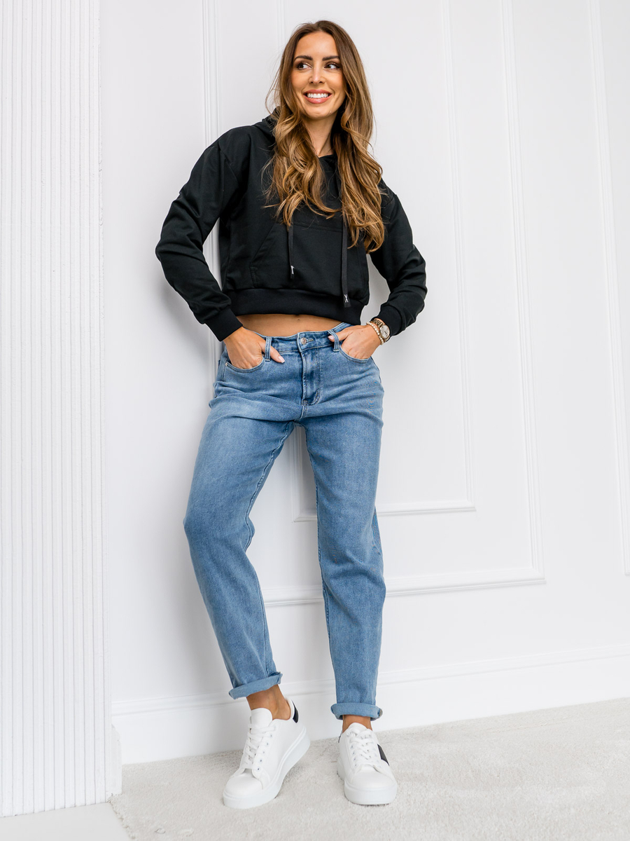Eye-catching black women's sweatshirt 8B939 from the Bolf collection. The hoodie is pulled over the head and has a drawstring adjustable hood. The bottom and sleeves are finished with a welt, which allows for a perfect fit. The combination of cotton and polyester makes the material flexible, thanks to which it does not restrict movement and is very comfortable to wear. In addition, the sweatshirt has a kangaroo pocket where you can fit your phone or small items. It will work well in combination with mom fit jeans.