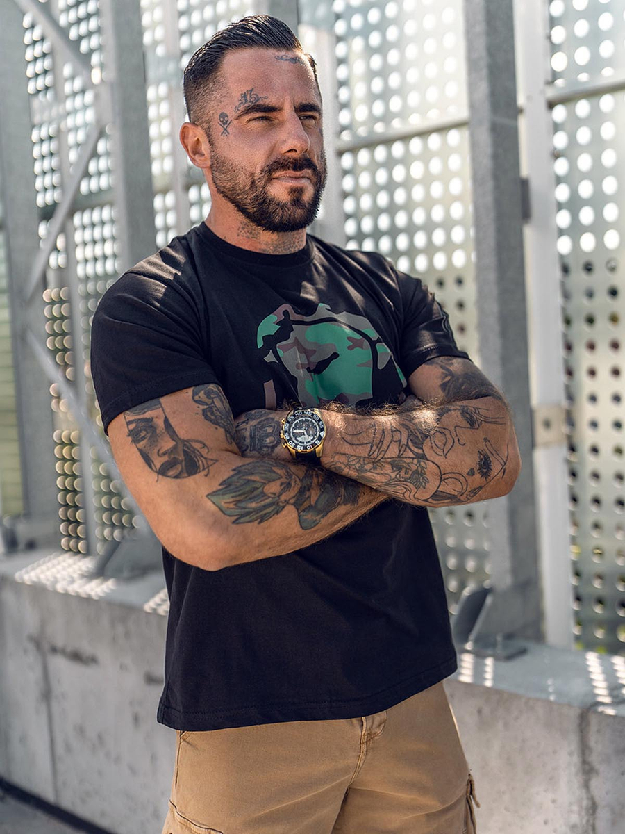 Cool black men's printed T-shirt 192379A from the Bolf collection. Made of high-quality cotton, it is soft and pleasant to the touch. The round neckline and fitted cut make it perfectly emphasizes the figure, while not restricting movement. The print on the front adds character and individuality. Regardless of whether you are going to the city with friends, to work or shopping, this t-shirt model will work perfectly. It is easy to combine it with other items of clothing. It goes well with jeans, joggers and shorts.