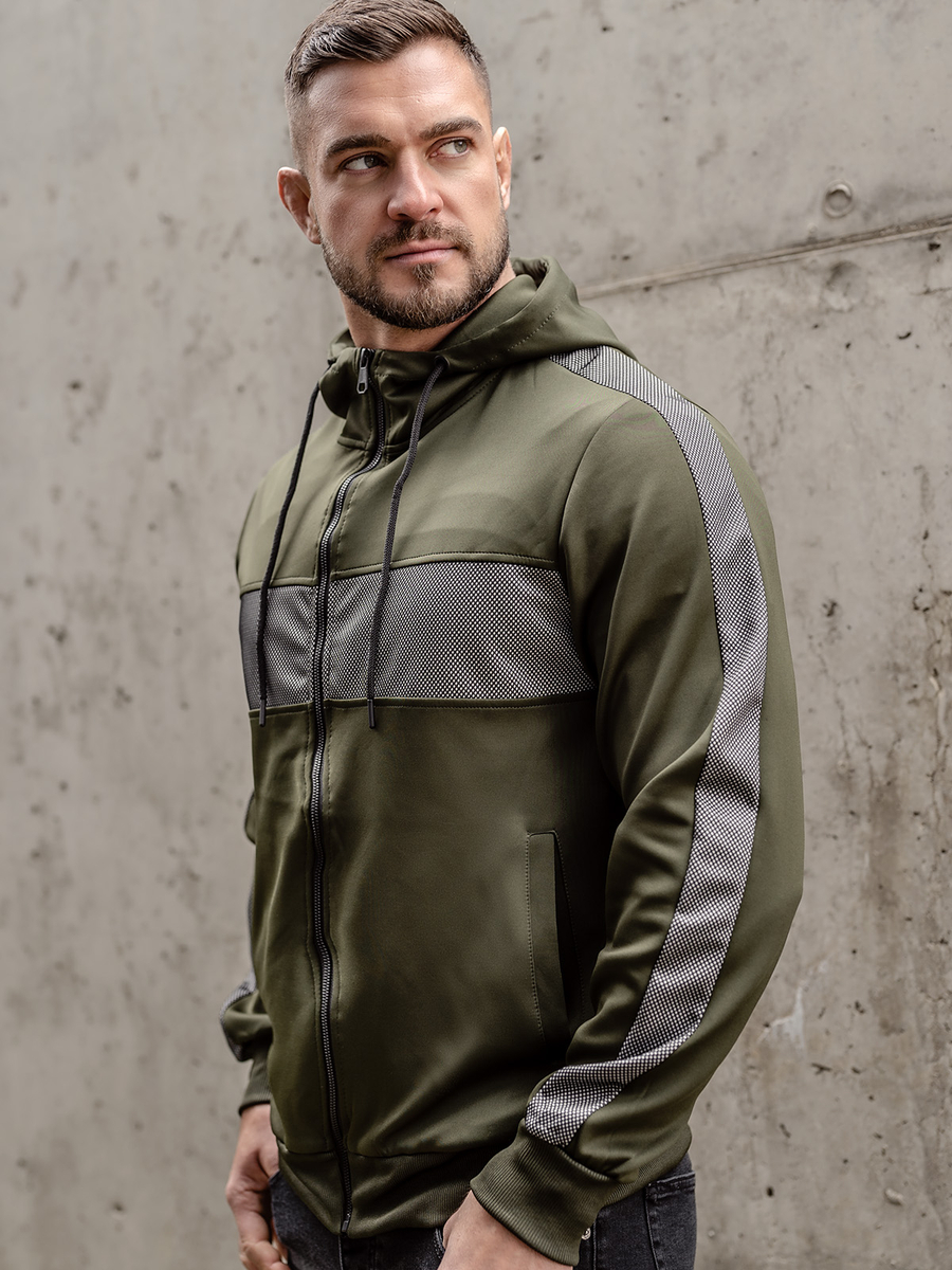Fantastic khaki men's printed hoodie with a zipper 27B8121A from the Bolf collection. Classic cut sweatshirt with a zipper and a practical adjustable hood. The bottom and sleeves are finished with a welt which provides warmth and protection against wind on colder days. Design and distinctive print on the front and sleeves adds a mega fashionable look. The sweatshirt has two side pockets without fastening. It is made of a sweatshirt fabric that is very pleasant to the touch. It will be perfect for everyday use as well as for any type of training. Combine it with sweatpants to create a classic sporty outfit. A casual sweatshirt will look great with our jeans, a T-shirt and a leather jacket.