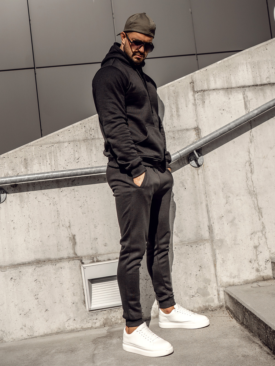 Fantastic black sport men's tracksuit D003A from the Bolf collection. The set includes a short hoodie and sweatpants. The pants are adjustable at the waist with a strong welt and drawstring, and two pockets on the sides. A simple, fitted cut gives them a sporty look. It was made of a soft and pleasant in touch fabric. A tracksuit set can be a universal base for building everyday or sports stylizations. Both the sweatshirt and pants can be combined with other items of clothing, thus obtaining many possibilities for creating everyday stylizations. The set will perfectly match a T-shirt, a lightweight jacket or a sport jacket. Sweatsuits are recommended to be worn at home, on a walk, while shopping, or during sports in the gym or outdoors.