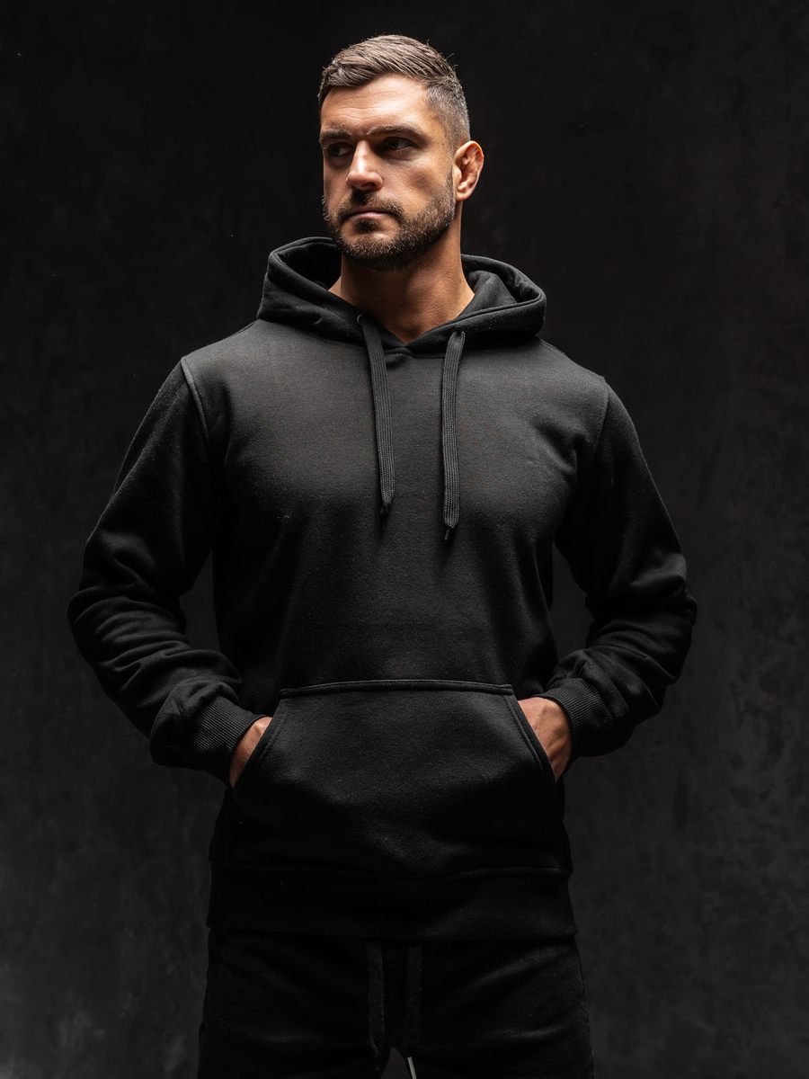 Great black men's hoodie 2009A1 from the Bolf collection. It has an adjustable hood and a practical kangaroo pocket at the front. The sport look is provided by the straight design. There is a drawstring-adjustable waist and bottom. It is made of soft, smooth sweatshirt fabric in a uniform color. This model is distinguished by rich colors, it can be found in more than twenty color variants, thanks to which it easily fits into many outfits. Wear it all year long. On many occasions. Shopping? Relax? Even for a spontaneous date, it will be appropriate. The product is perfect for everyday wear, it is a must-have item in any stylish men's wardrobe. The stylish colour really boosts up the outfit. It works well with jeans, cargo trousers or joggers. Match it with sweatpants or a lightweight jacket. Wear it to the gym or on an outdoor workout. This model is often chosen by buyers. Check out this model in the reviews of influencers and IG. It attracts with great workmanship and a good price compared to the competition. The sweatshirt also has its counterpart in the women's version, which also breaks popularity records.