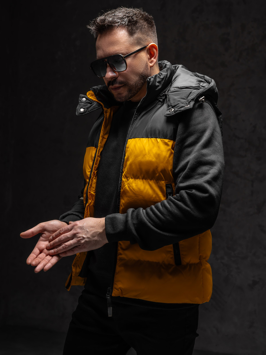 Superb camel men's quilted gilet with a hood 1189A1 from the Bolf collection. The vest includes a detachable hood that protects against getting wet on rainy days. The product is fastened with a convenient, zipper. The vest has a stand-up collar. A big advantage of the product are three zippered pockets. Two spacious outer pockets can act as protection for your hands against frost on cold days. The inner pocket is perfect for storing keys, phone, documents or other small items. The hood has strings that allow it to be adjusted. This makes it an excellent protection against cold and rain.The vest is intended for every active man who is in favor of a sporty style. The product will be perfect for unfavorable weather conditions. It will be perfect for keeping warm during weekend trips, long evening walks or jogging in the forest or park. You will feel very comfortable during hiking or long, demanding runs. The flexibility of the material makes the product perfectly adapted to poor conditions and high physical activity. The elegant cut will make you look stylish and fashionable during weekend getaways with friends or family. The product is available in several other colors, so you can match the vest to many outfits and styles. The product can be combined with jeans, joggers and a long sleeve top. Match it also with a shirt or a sweater. This product is a must have in the wardrobe of every man, thanks to its versatility, it can be used on many occasions, both sports and social. The vest is made of 100% polyester, which is a material that will ensure comfort during everyday use of the product. Thanks to the excellent price-quality ratio, the product will be perfect as a birthday or Christmas gift. It will satisfy even the most demanding men.