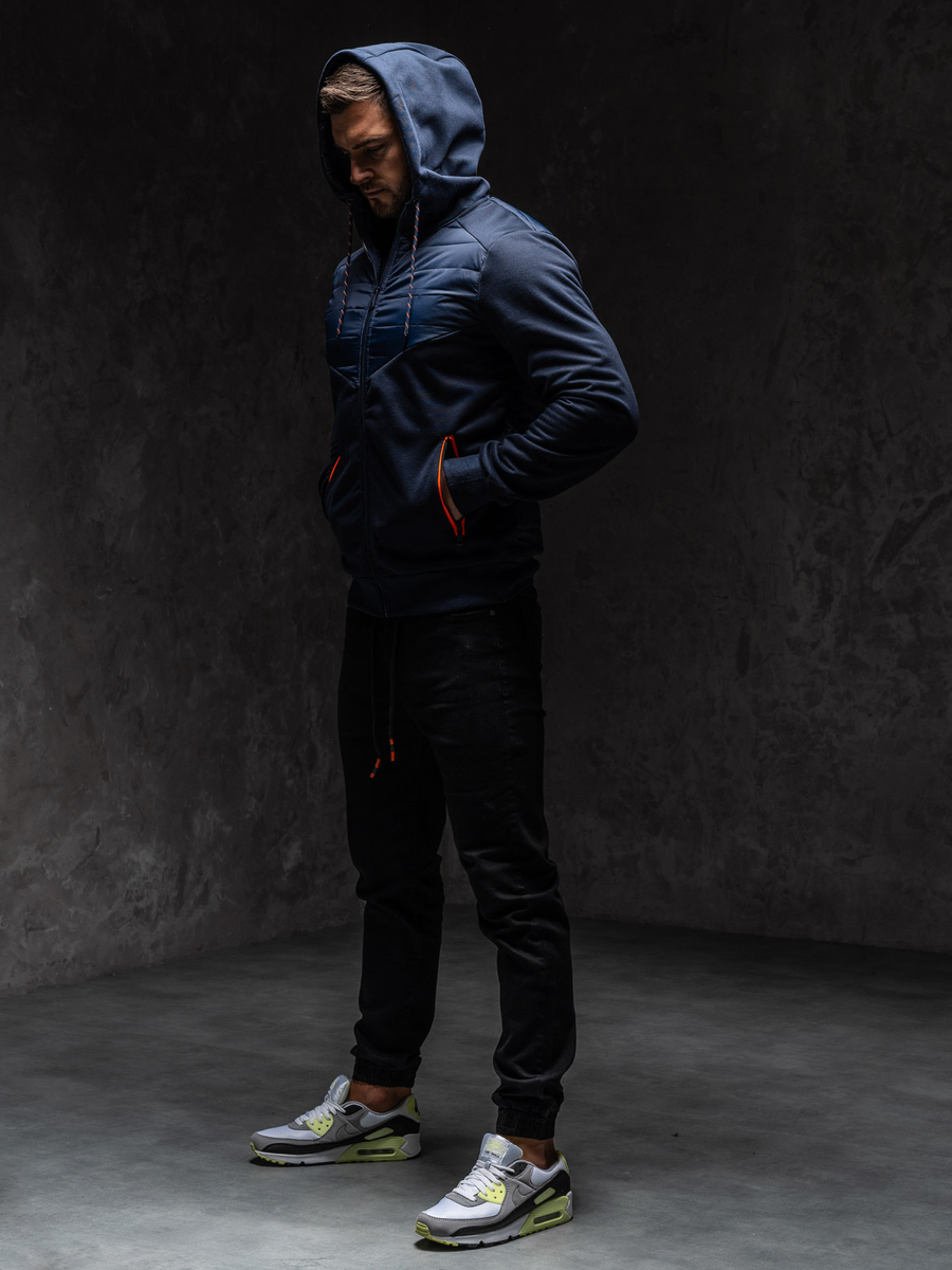 Stylish navy blue men's lightweight jacket KS2149A1 from the Bolf collection. It is fastened with a zipper, has a hood connected to a collar. There are quiltings all over adding sport style. The bottom and sleeves are finished with a welt, thanks to which the jacket adapts to the figure. It is made of 100% polyester. It has two practical outer pockets with zippers. Thanks to its versatility, the product can be combined with many styles. Perfect for a walk, meeting with friends or a trip to the city. This jacket will create a perfectly matched look with chinos or sweatpants.