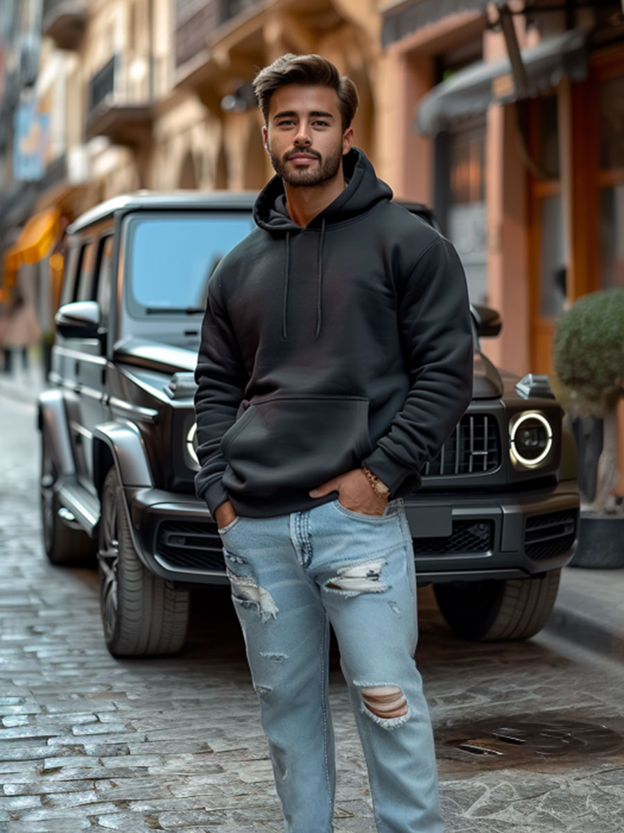 Great black men's hoodie 2009A2 from the Bolf collection. It has an adjustable hood and a practical kangaroo pocket at the front. The sport look is provided by the straight design. There is a drawstring-adjustable waist and bottom. It is made of soft, smooth sweatshirt fabric in a uniform color. Wear it all year long. On many occasions. Shopping? Relax? Even for a spontaneous date, it will be appropriate. The product is perfect for everyday wear, it is a must-have item in any stylish men's wardrobe. The stylish colour really boosts up the outfit. It works well with jeans, cargo trousers or joggers. Match it with sweatpants or a lightweight jacket. Wear it to the gym or on an outdoor workout. This model is often chosen by buyers. Check out this model in the reviews of influencers and IG. It attracts with great workmanship and a good price compared to the competition. The sweatshirt also has its counterpart in the women's version, which also breaks popularity records.