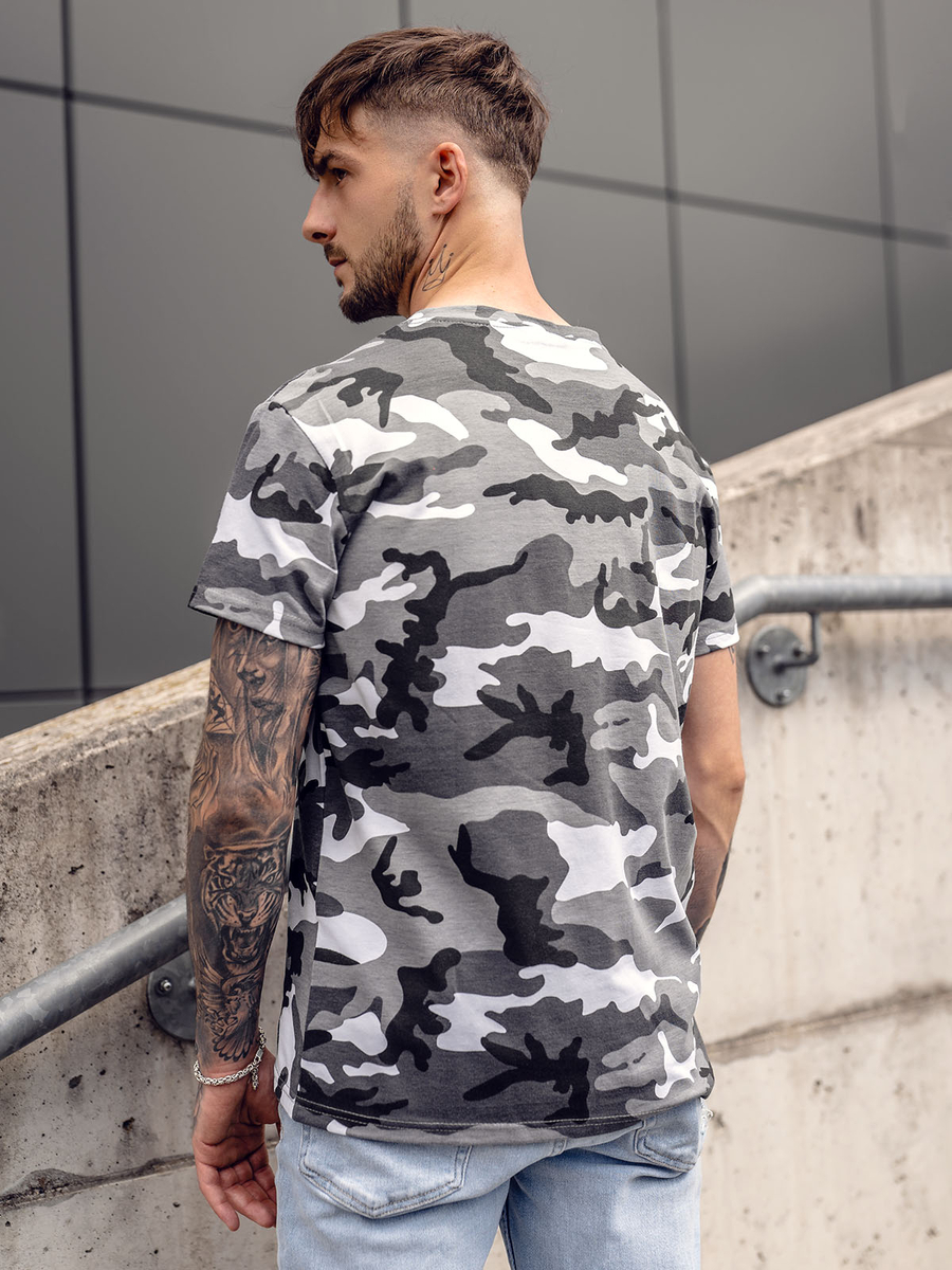 Unique grey men's T-shirt in military pattern S807A1 from the Bolf collection. The eye-catching color will be the perfect complement to your wardrobe. The T-shirt has a round neckline, so the product can be easily and freely put on over the head. The bottom of the T-shirt is rounded, which makes it fit perfectly to every figure. The jersey is flexible and will fit your body perfectly. It is made of breathable material.