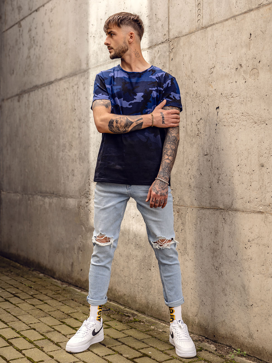 Great navy blue men's military printed T-shirt S808A1 from the Bolf collection. The T-shirt has a fashionable camo pattern as well as a practical round neckline. The T-shirt is stylized as an hombre. It consists of 65% cotton and 35% polyester, which makes the T-shirt stretchy and perfectly fits the figure. The sleeves and the bottom are trimmed with a thread that perfectly matches the colors of the T-shirt.The T-shirt is perfect for everyday wear, a modern look and a bold motif will make you stand out from other men. The modern hombre motif adds an interesting character to the shirt. The product is perfect for trips to the city and jogging. The product is comfortable and loose, it will work on many occasions. Characteristic colors will be eye-catching. Military style will give you originality and uniqueness. The T-shirt is perfect for everyday occasions, such as going out to the city, walking or jogging around the city or park. The flexibility of the material will ensure comfort while running or exercising. The T-shirt is available in several color variants. You can freely choose the color of the T-shirt to your style: more pastel or more subdued. A T-shirt should be in every men's wardrobe, it is original and adds character. It works well with jeans or joggers. They also perfectly match with cargo trousers which adds a completely military character. Match it up with sweatpants. A wide range of colors and sizes makes the T-shirt a must have for every man who is not afraid of experiments with fashion and bold styling. The excellent price-quality ratio makes the T-shirt a great birthday or Christmas gift. This product will add color and uniqueness to your wardrobe.