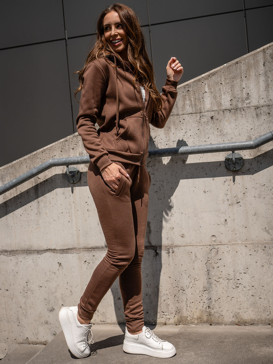 Must have 2-piece chocolate women's outfit 0003A from the Bolf collection. The set includes a sweatshirt and sweatpants. The sweatshirt is fastened with a zipper, has an adjustable hood and two pockets. Sweatpants are adjustable at the waist with a strong welt and drawstring. They have two pockets at the front and the legs are finished with a welt, ensuring the pants fit perfectly to the figure. A simple, fitted cut gives them a sporty look. It was made of a soft and pleasant in touch fabric. The tracksuit set itself creates an ideal, sporty outfit, perfect not only for training, but also for a casual day at home or a trip to the mountains. You can pair it with a lightweight jacket, a sport jacket or a gilet.