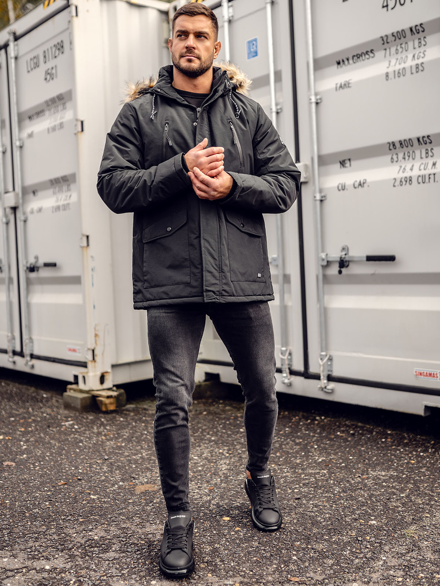 Stylish black men's winter parka jacket WX032A from the Bolf collection. It is equipped with zip-fastening. It has a stand-up collar and a detachable hood, thanks to which you will protect yourself from wind and rain. A unique, decorative element is the detachable fur on the hood and the logo on the sleeve. The fitted and simple cut makes everyone look exceptionally advantageous in it. The jacket has practical chest pockets with a zipper and outer pockets covered with a flap fastened with a snap. There is one more pocket inside. The jacket is made of high-quality materials, which makes it very comfortable and pleasant to the touch. Consists of 100% polyester. Thanks to its versatility, the product can be combined with many styles. It will create a perfect combination with jeans and a long sleeve top.