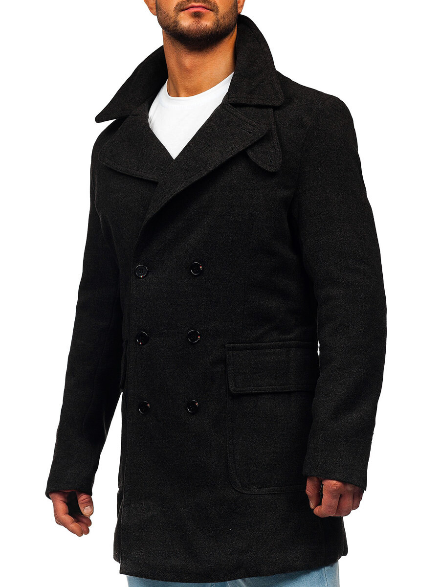 Exceptional black men's warm winter coat 1048A from the Bolf collection. It has got a button fastening and is double-breasted. There are two outside snap pockets with a flap and an inside button pocket. It's stylish and well-fitted. There is a reverse collar. The intensive colour works well in various stylings.